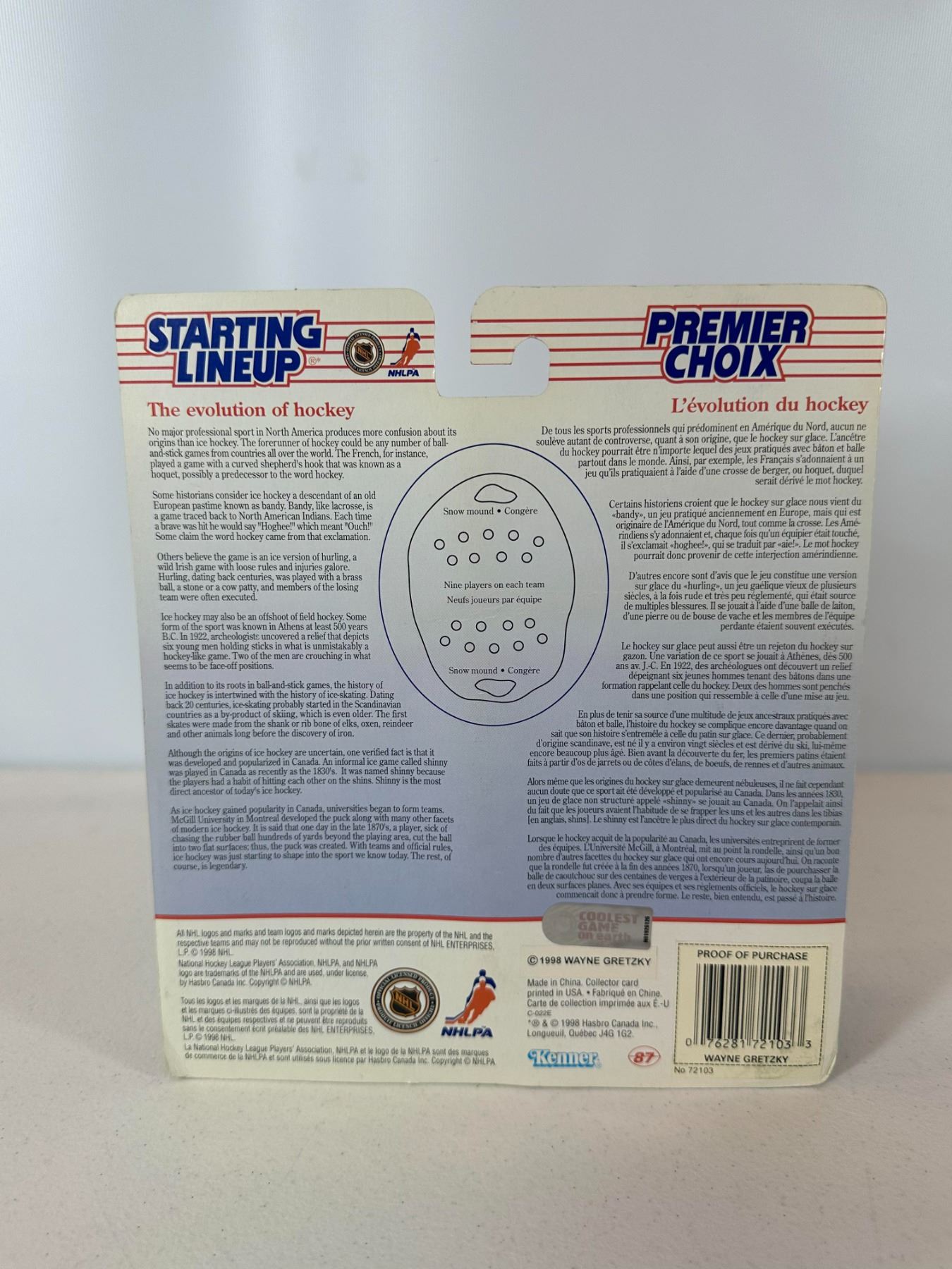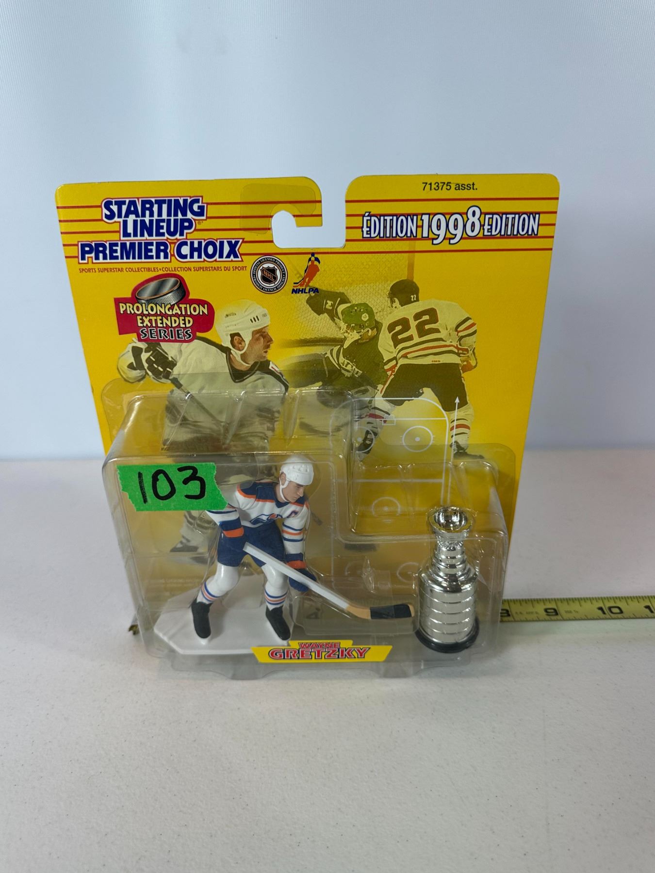 New old stock (NOS) 1998 Starting Lineup Premier Choice 'Extended Series' Wayne Gretzky figure in Edmonton Oilers uniform, including miniature Stanley Cup accessory. Factory sealed on original card backing. A desirable collectible highlighting Gretzky’s championship legacy with the Oilers.
