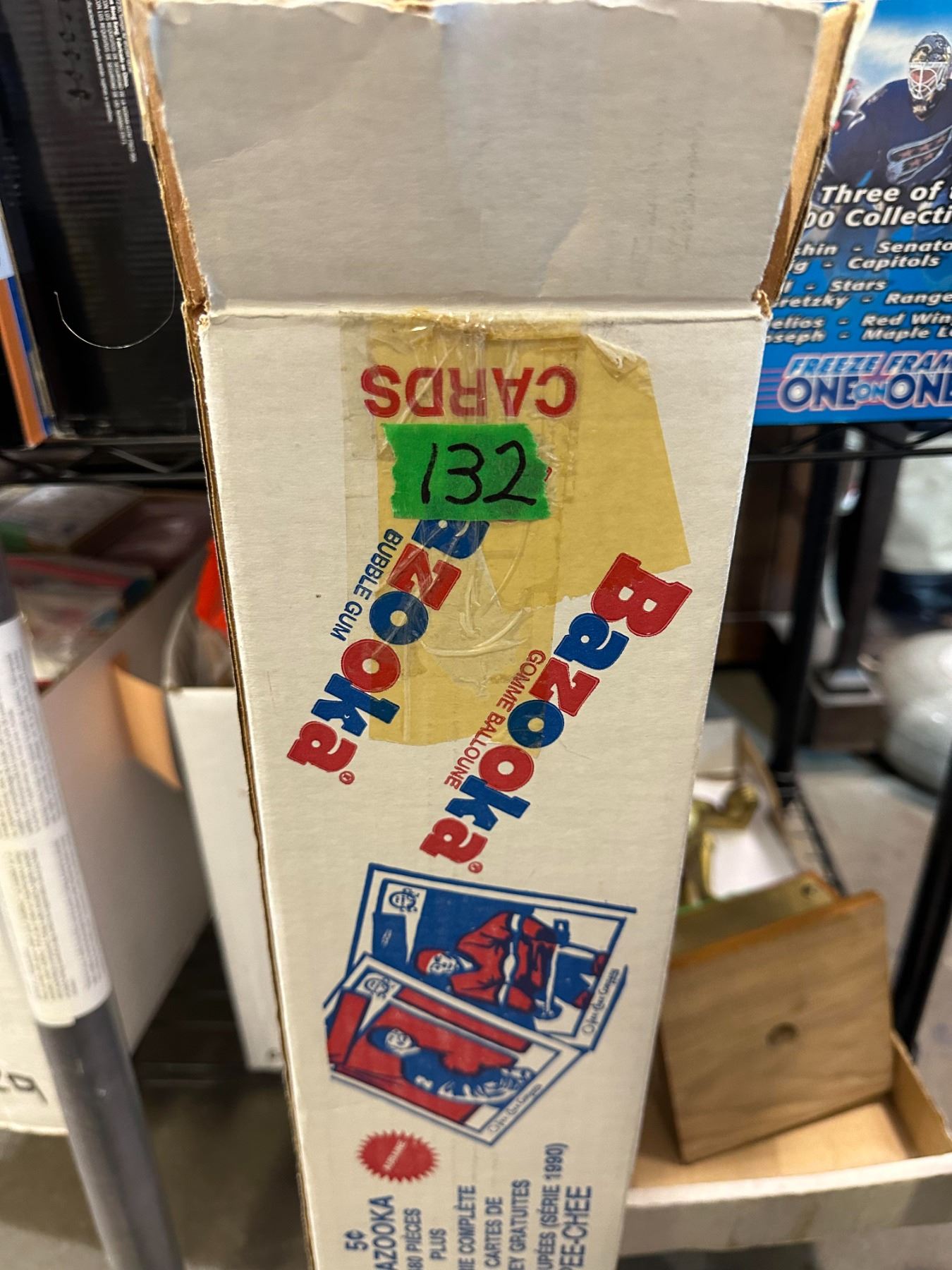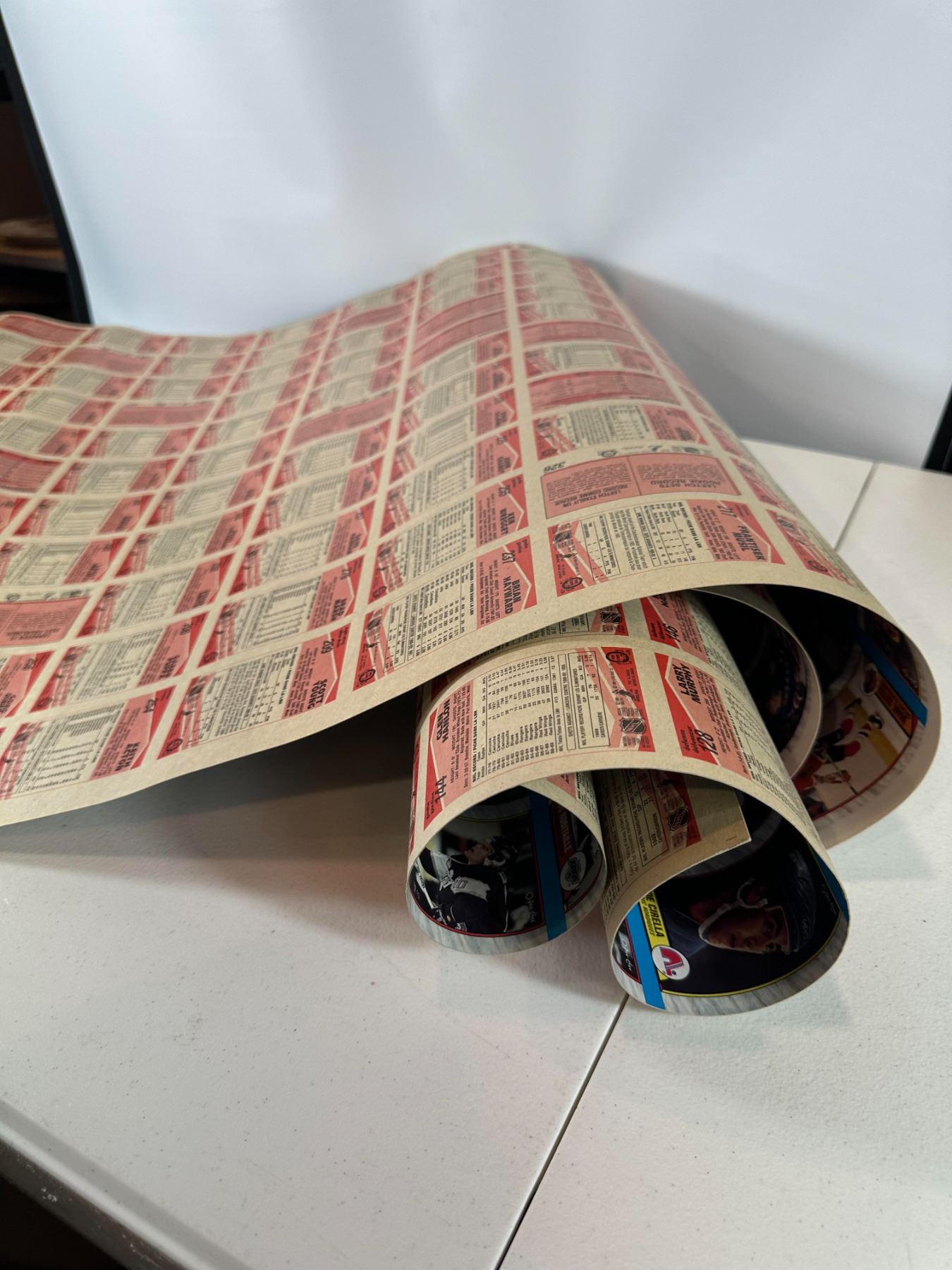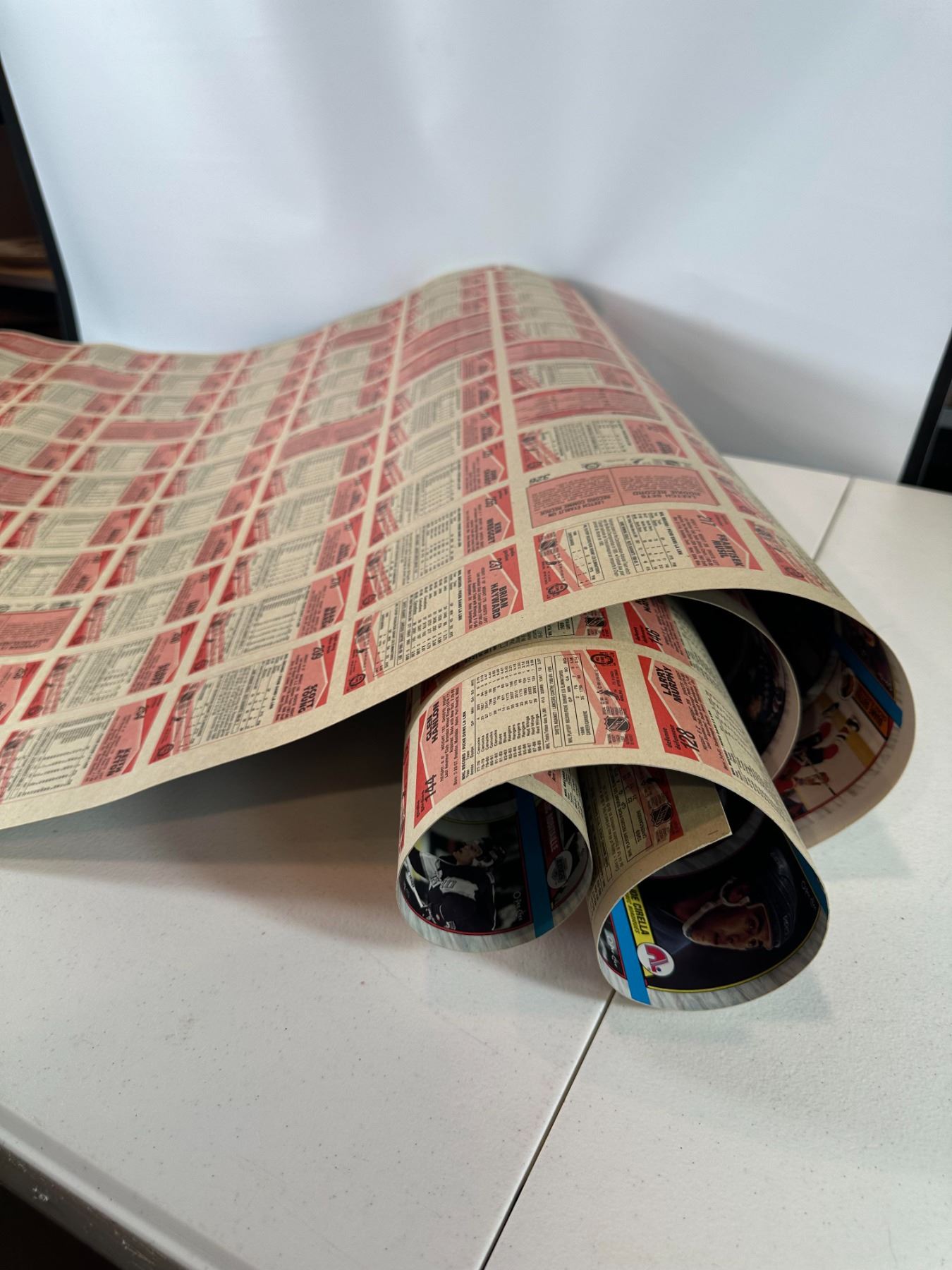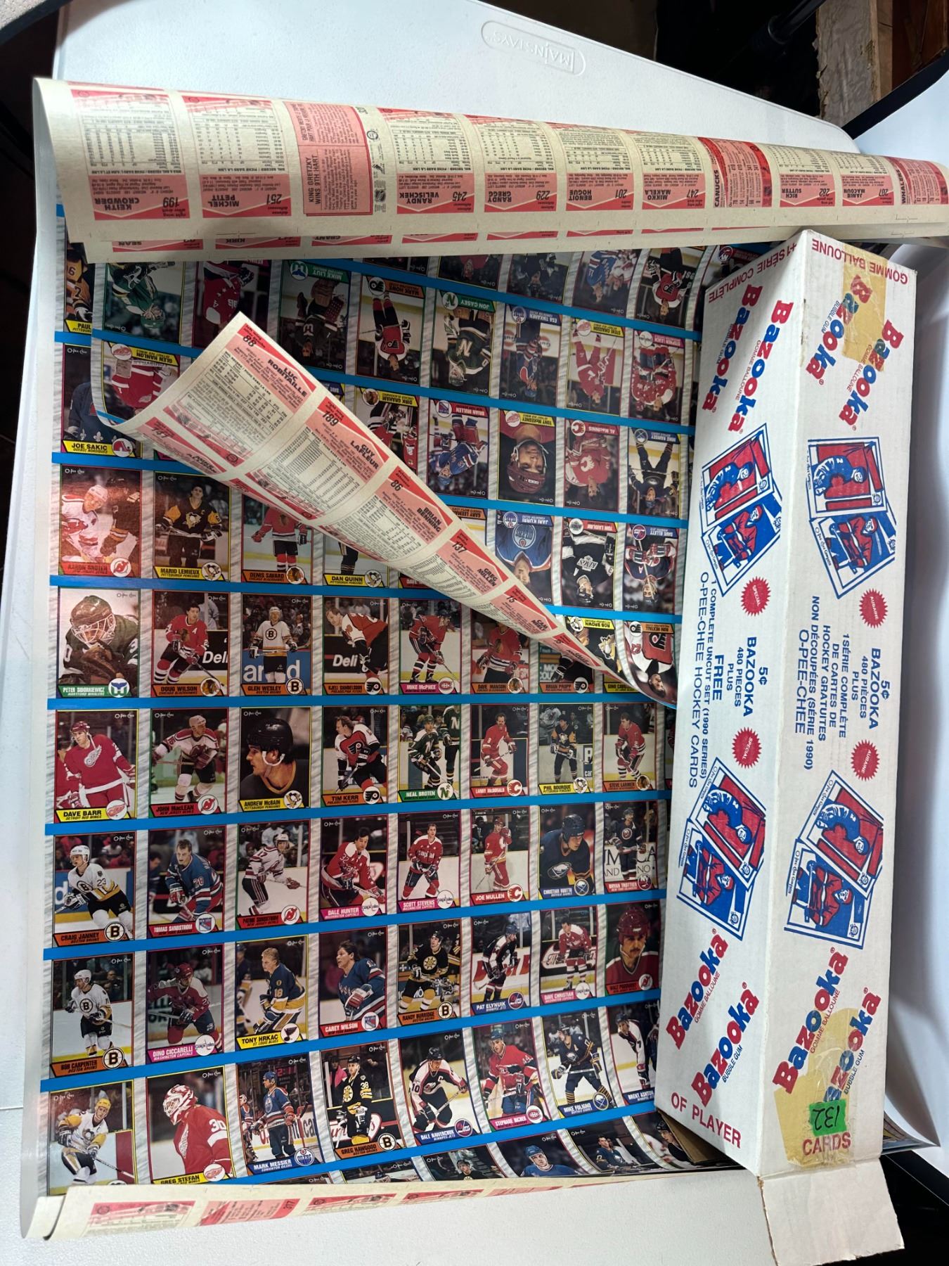 Collection of 1989 O-Pee-Chee uncut hockey card sheets featuring multiple star players and notable rookie cards including Joe Sakic and Brian Leetch. Includes original Bazooka/O-Pee-Chee packaging. Sheets display full card runs with stats on reverse. Highly collectible vintage hockey card production pieces.