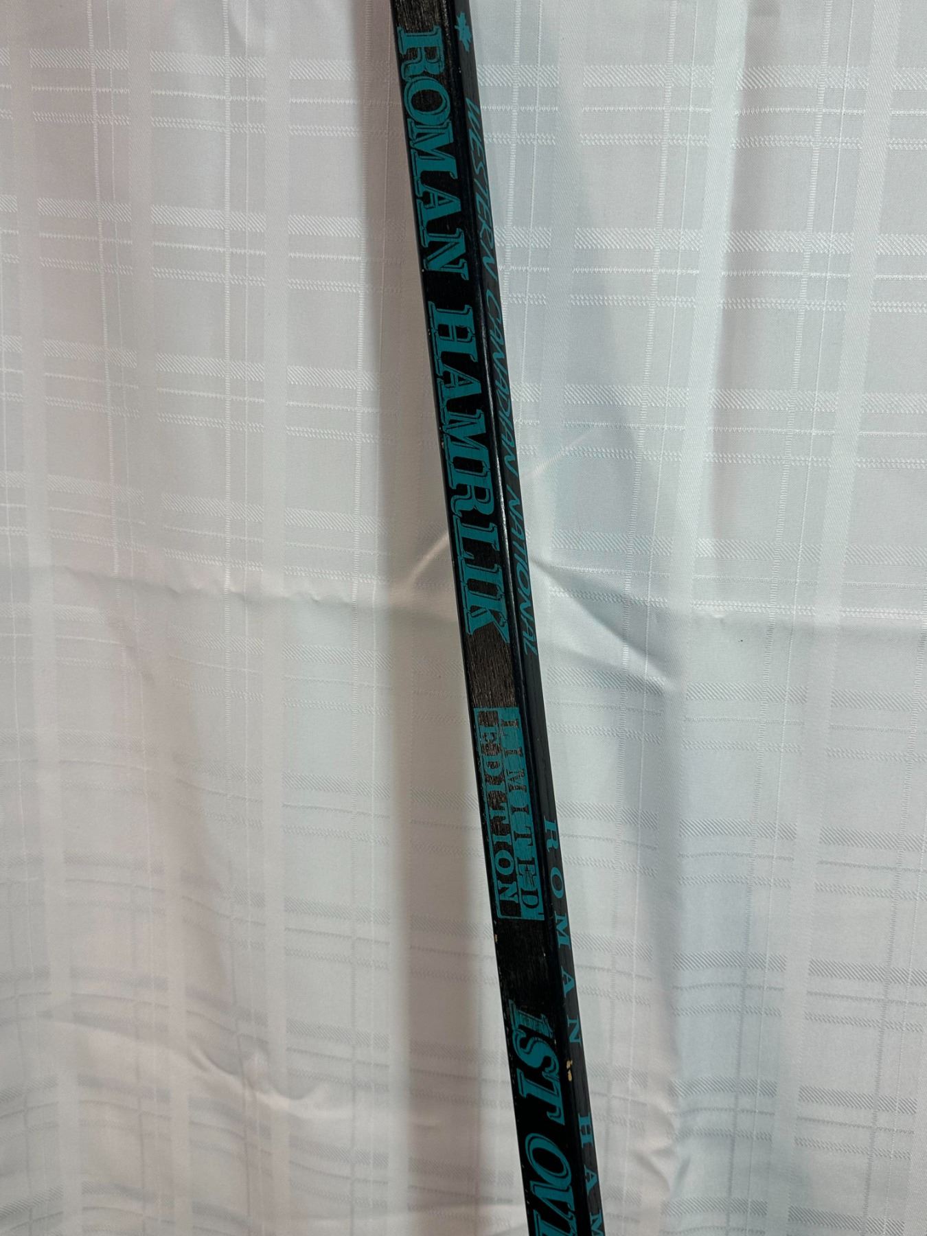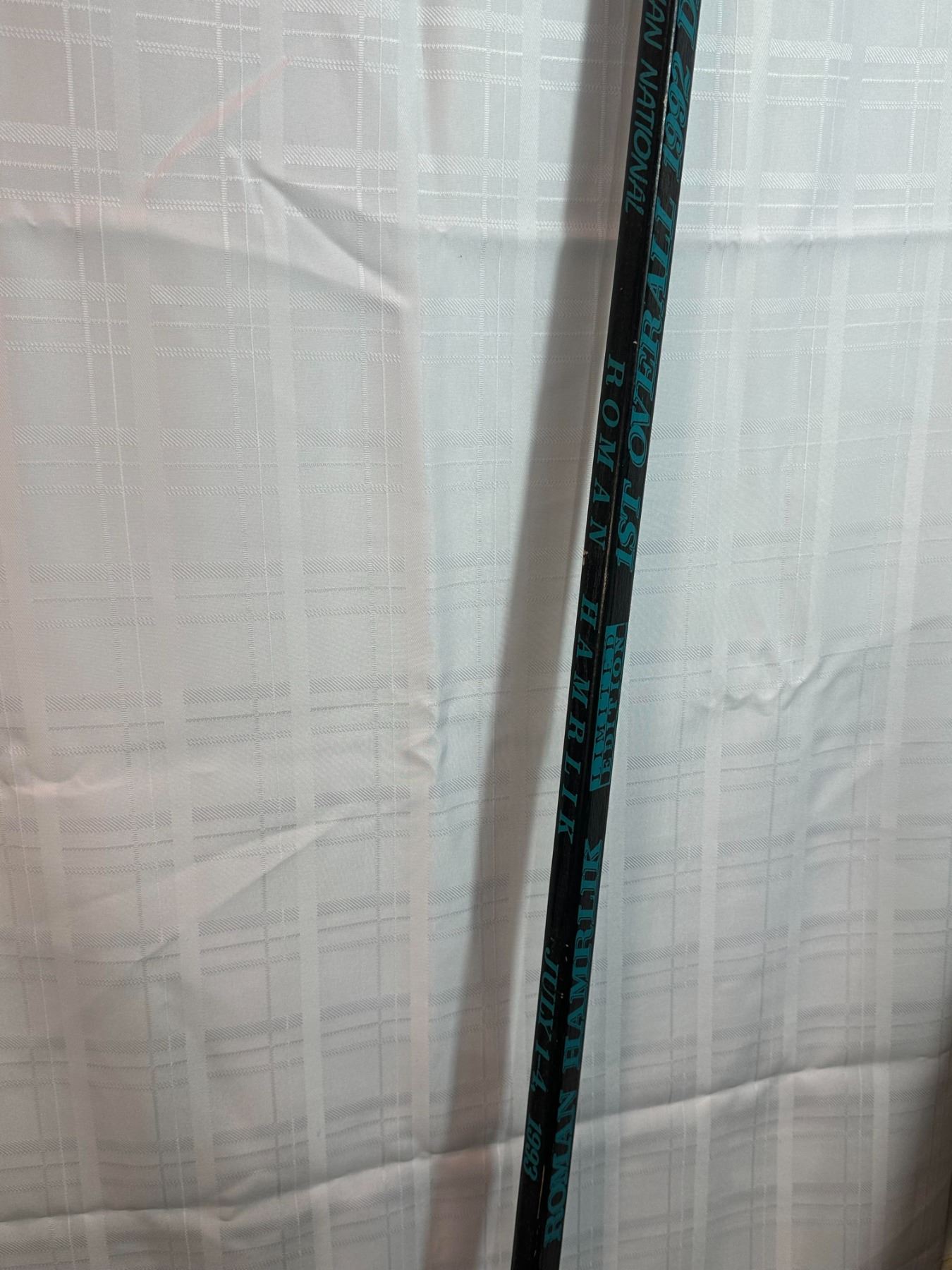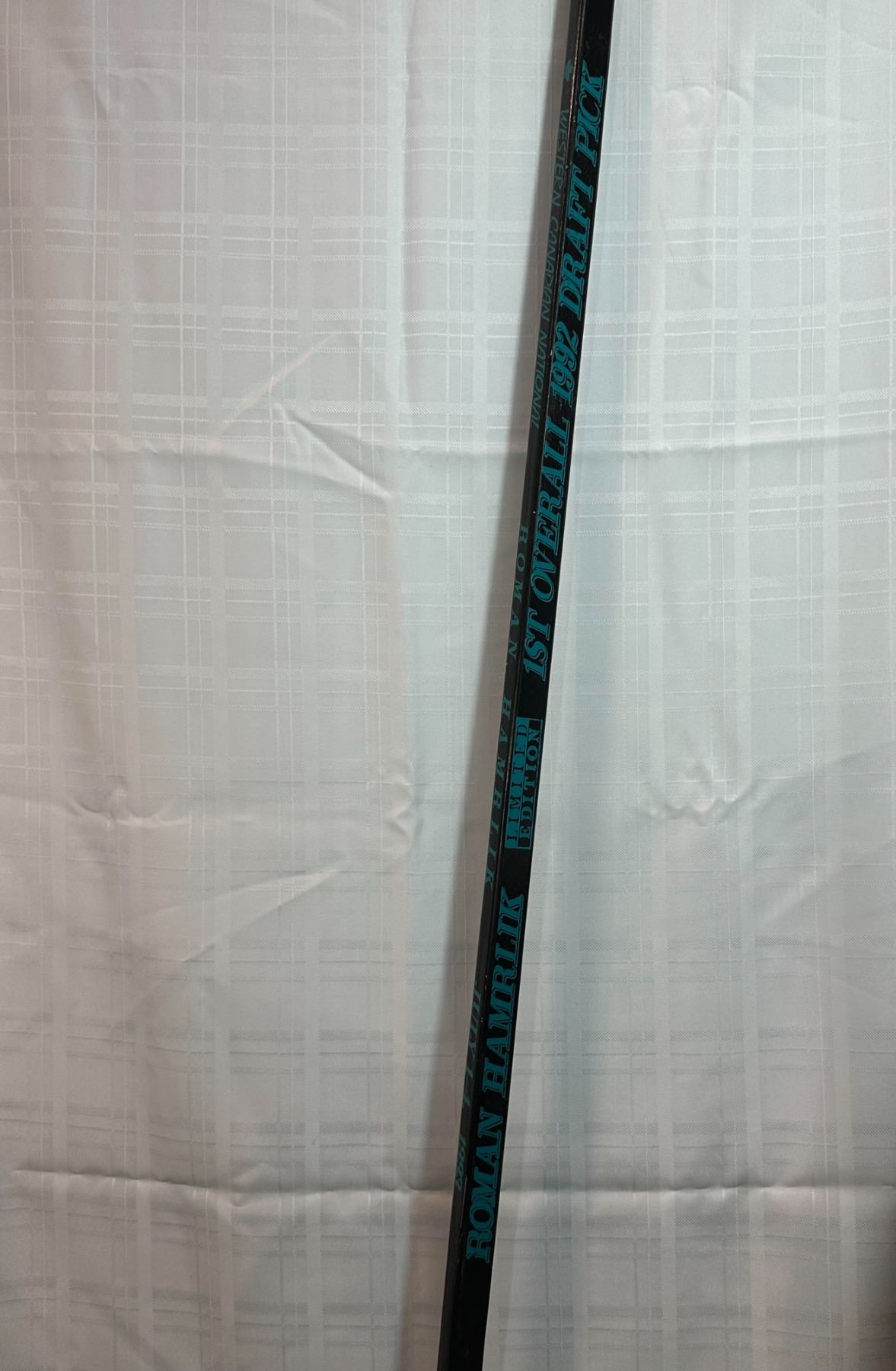 Commemorative hockey stick honoring Roman Hamrlik as a 1999 Lady Byng Trophy finalist. Features printed text referencing Western Conference and Hamrlik’s recognition for sportsmanship and performance. Wooden construction with natural blade and black shaft graphics. Displays light wear consistent with handling. A unique collectible piece for NHL fans and memorabilia collectors.