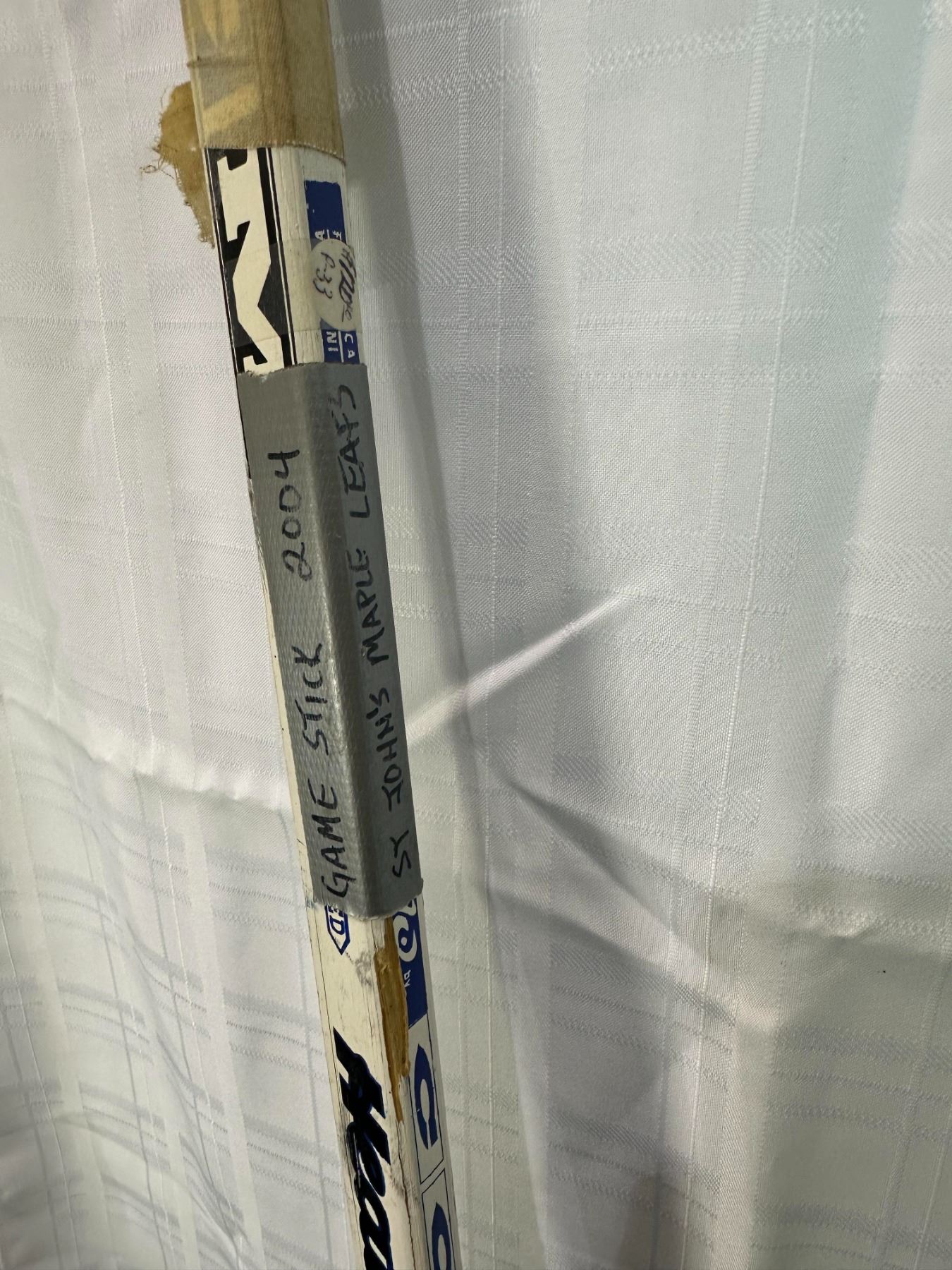 Koho graphite hockey stick with extensive visible game use including taped blade and wear. Stick features multiple player autographs on the blade and shaft. Handle is labeled 'Game Stick 2004 St. John's Maple Leafs,' indicating team-issued or game-used origin. A strong collectible piece combining team provenance and multiple signatures, ideal for hockey memorabilia collectors.