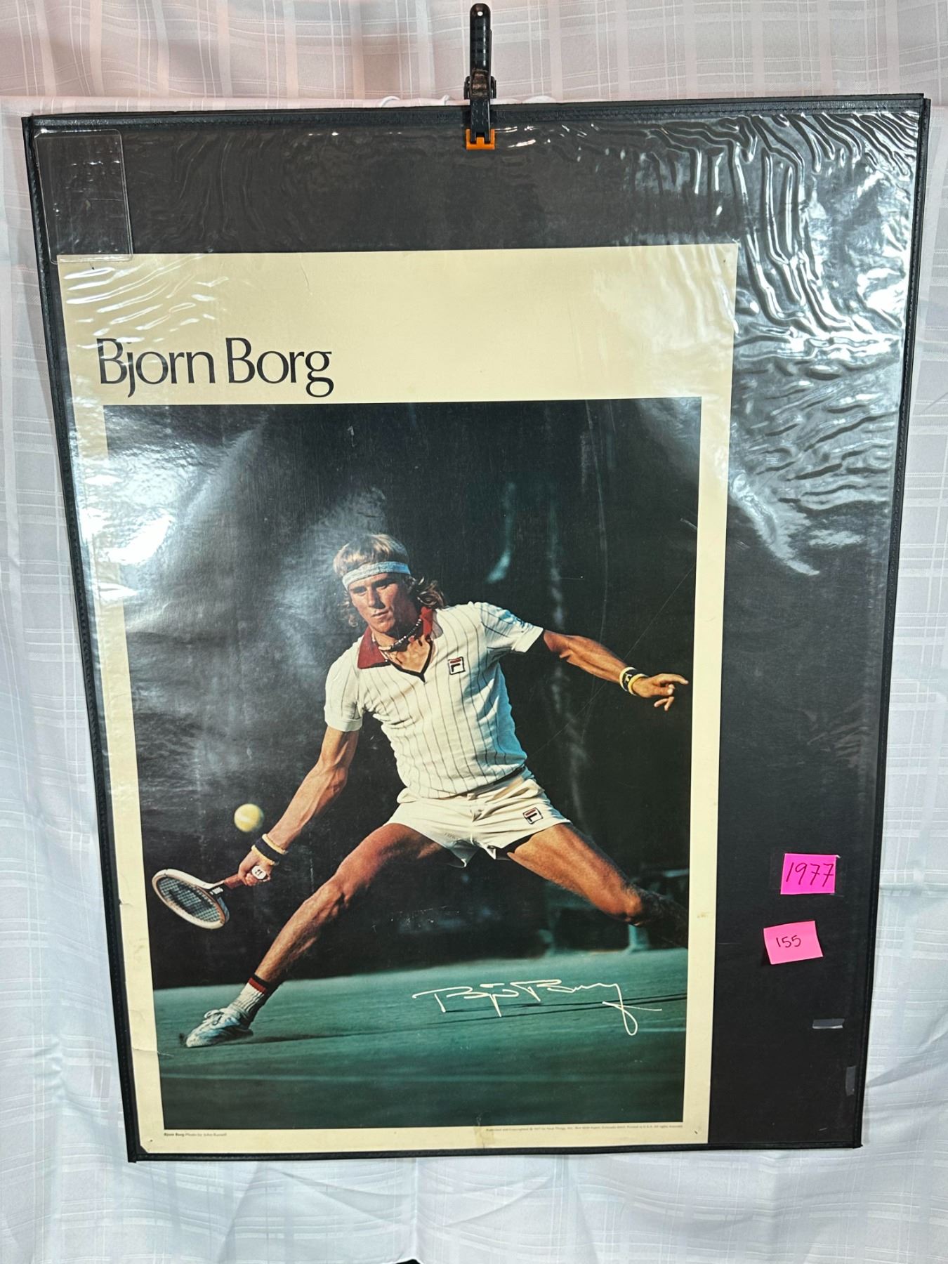 Framed vintage poster of tennis legend Bjorn Borg in action, featuring printed signature and period styling circa 1977. Classic sports imagery with black background border. Frame included; shows visible wear and aging to poster and edges.