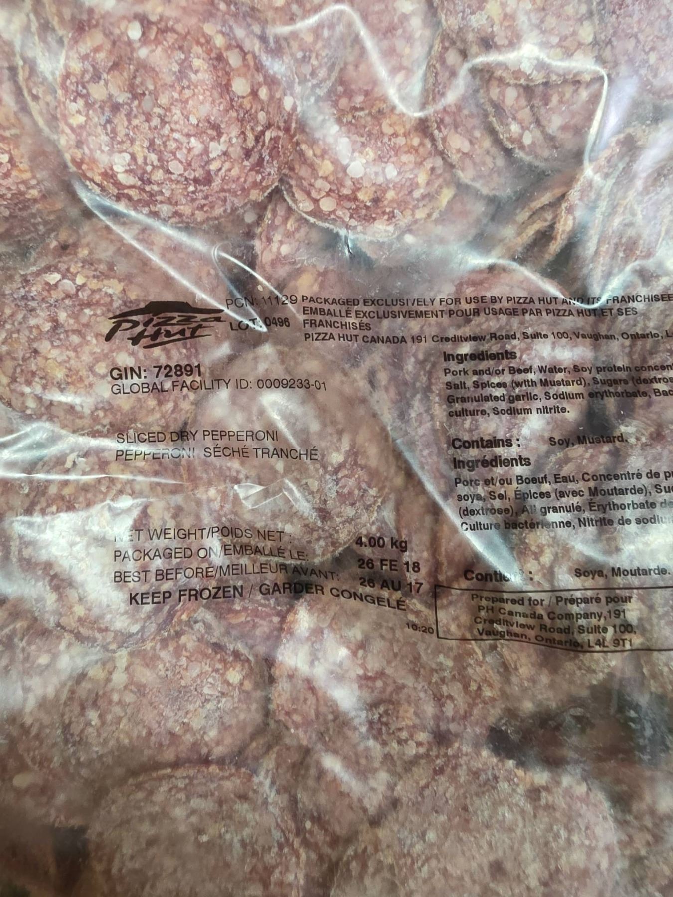 Lot 2224 Frozen Pepperoni, Sliced, 2 kg Package, Product Code 72981