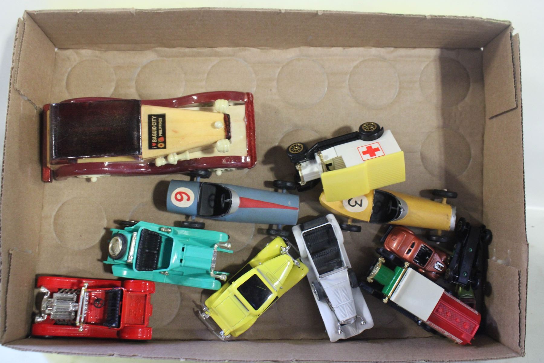 12 VINTAGE OLD-FASHIONED CARS & TRUCKS, TOYS