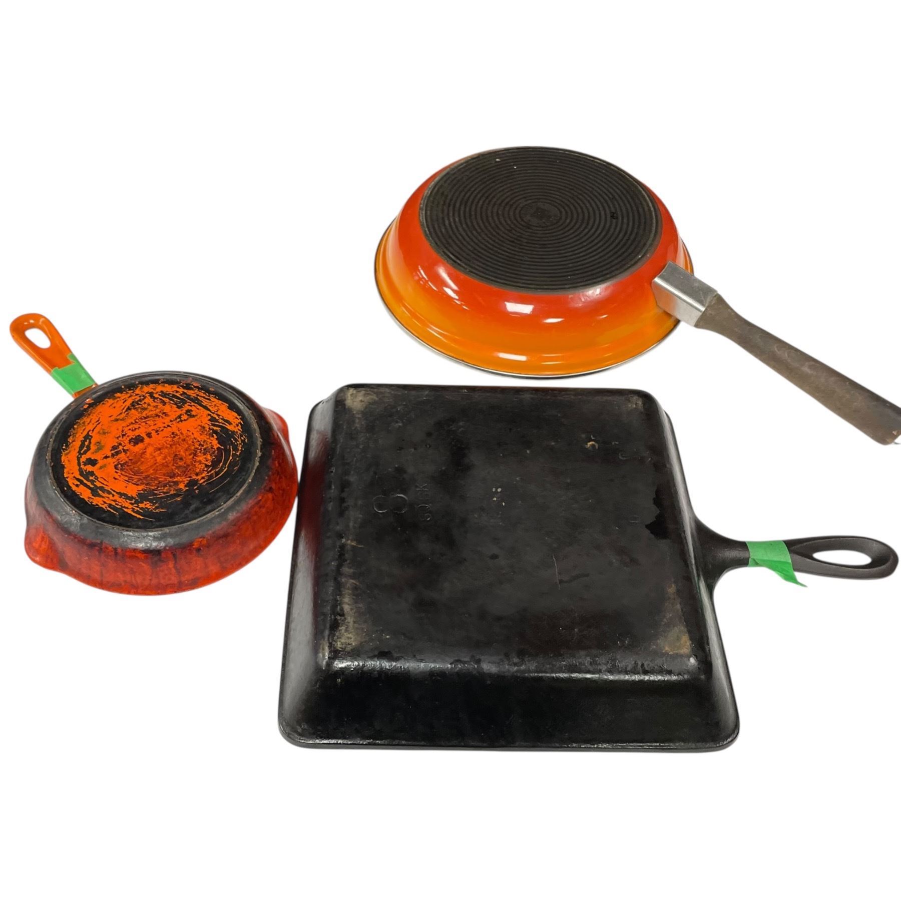 Square Cast Iron #8 SQ SK Cast Iron Pan and 2 Orange Enameled Pans