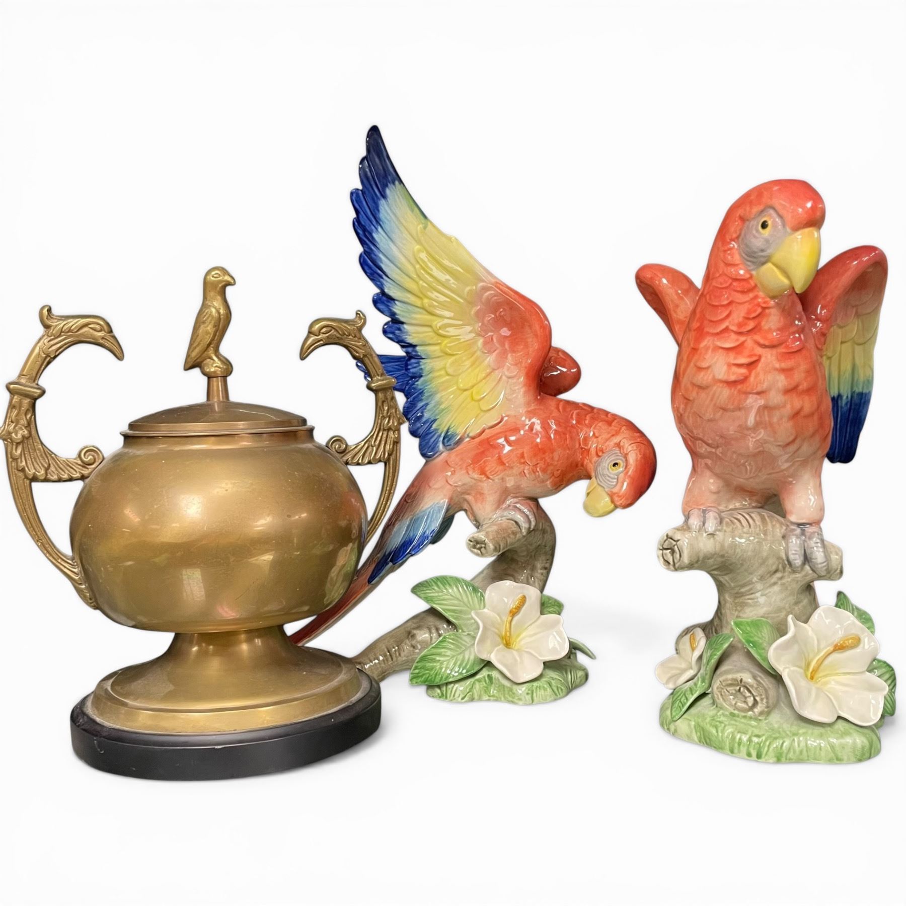Lot 537 Pair of FF Japan Porcelain Parrots and a Brass/bronze Centerpiece Featuring a Pair of Phoenix