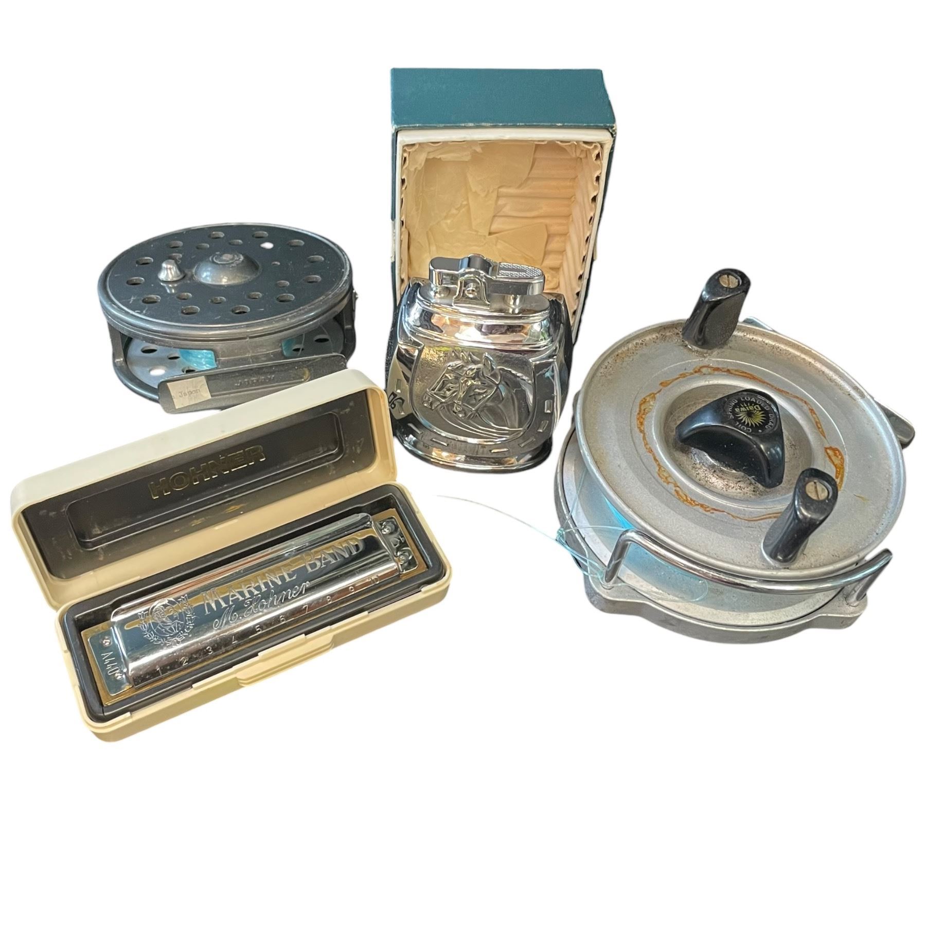 Lot 587 Men's Lot: Casting Reel, Fly Fishing Reel, Harmonica and Vintage Lighter