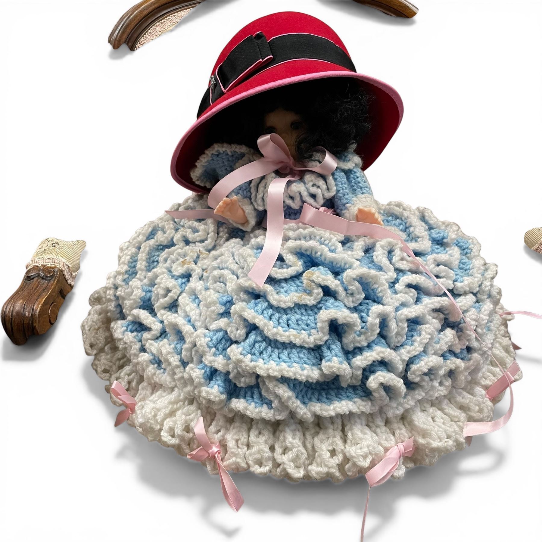 Vintage Bed Doll with Crocheted Dress * 14" tall x 15" diameter