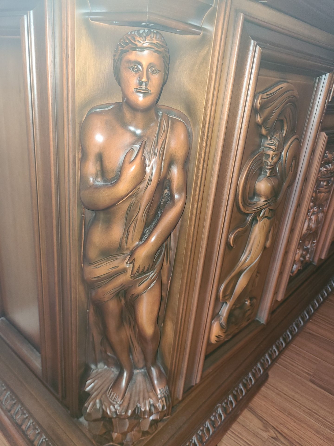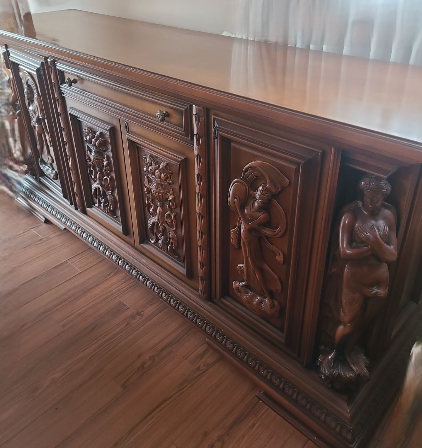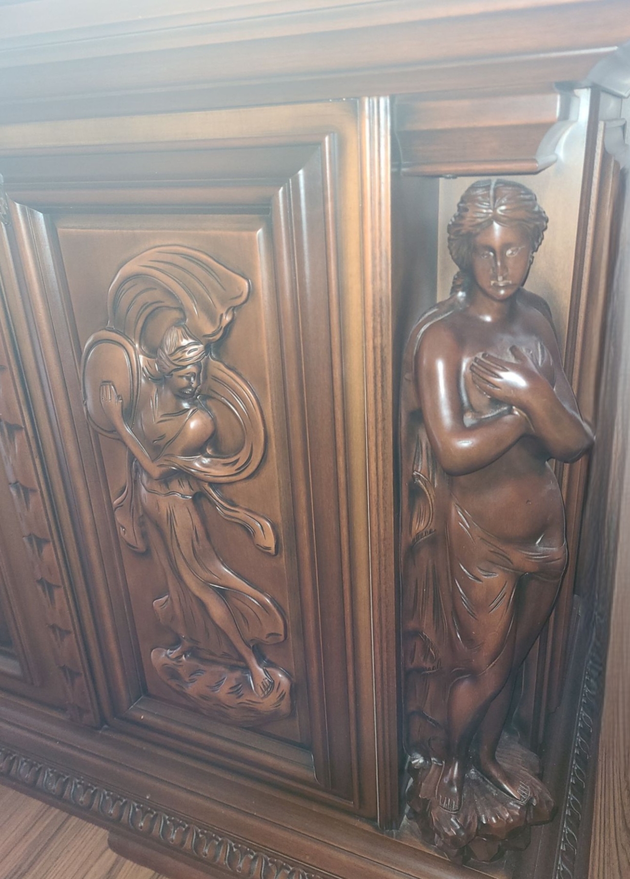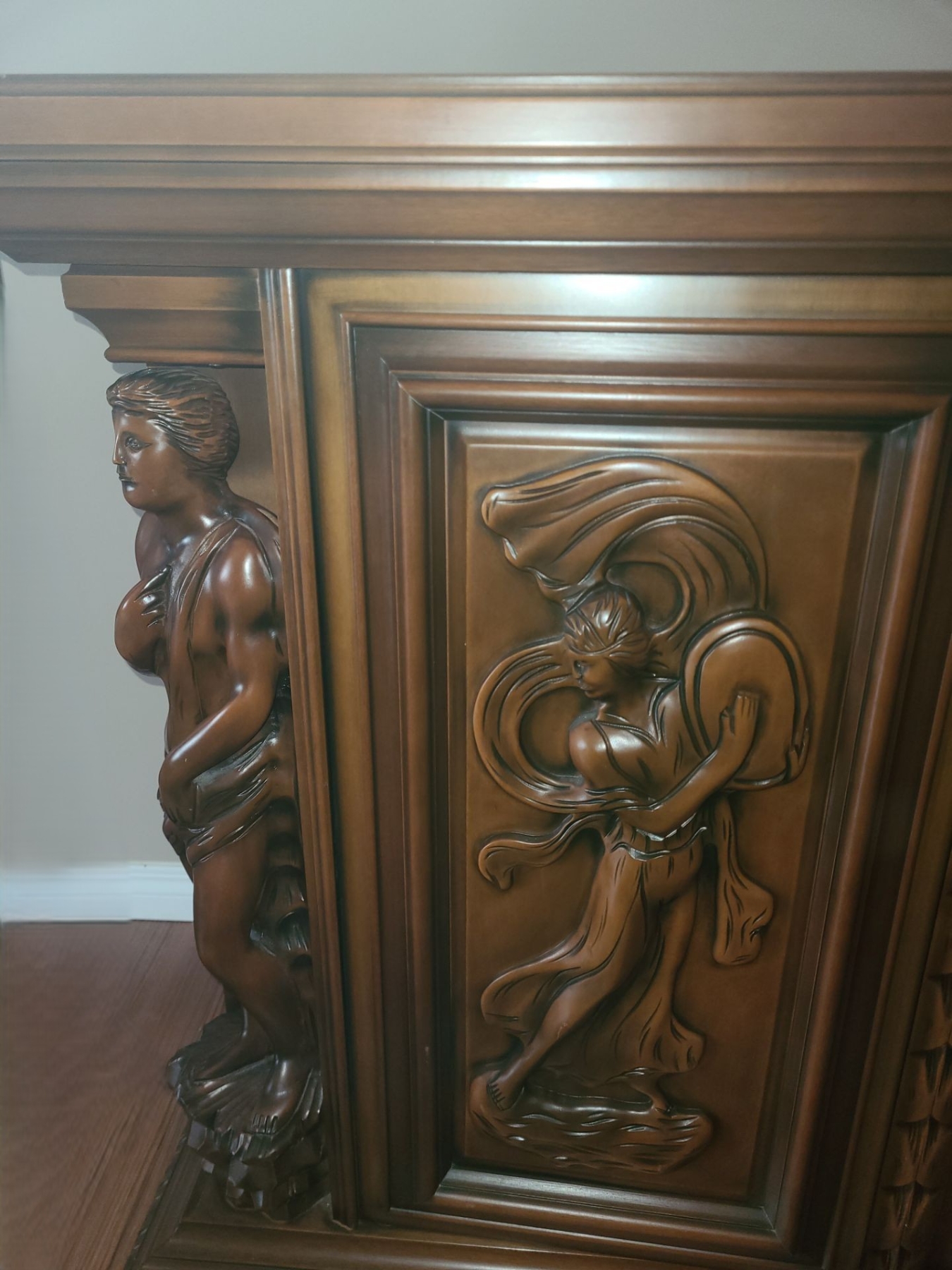 Lot 3 Vintage Italian Wood Sideboard w/ Carved Detail and Figures 79 W, 21 D, 37 T, Keys Included