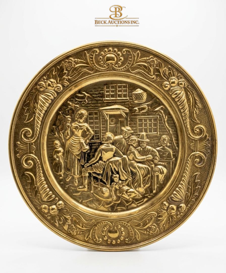 Lot 5 Vintage Embossed Brass Wall Plates Detailed Tavern Or Pub Scenes, The Mid-20th Century ENGLAND 14''