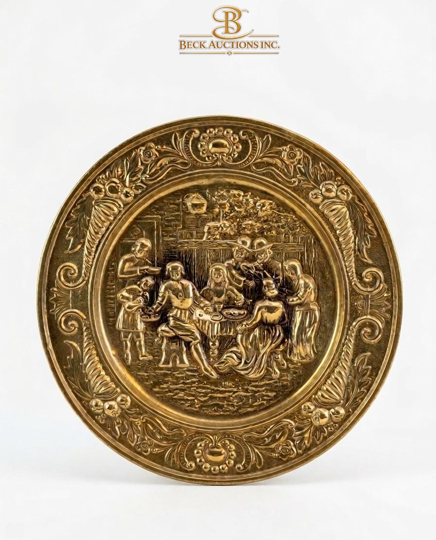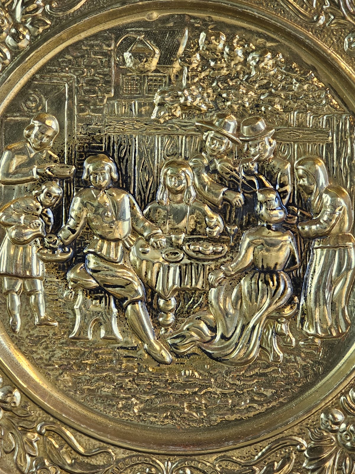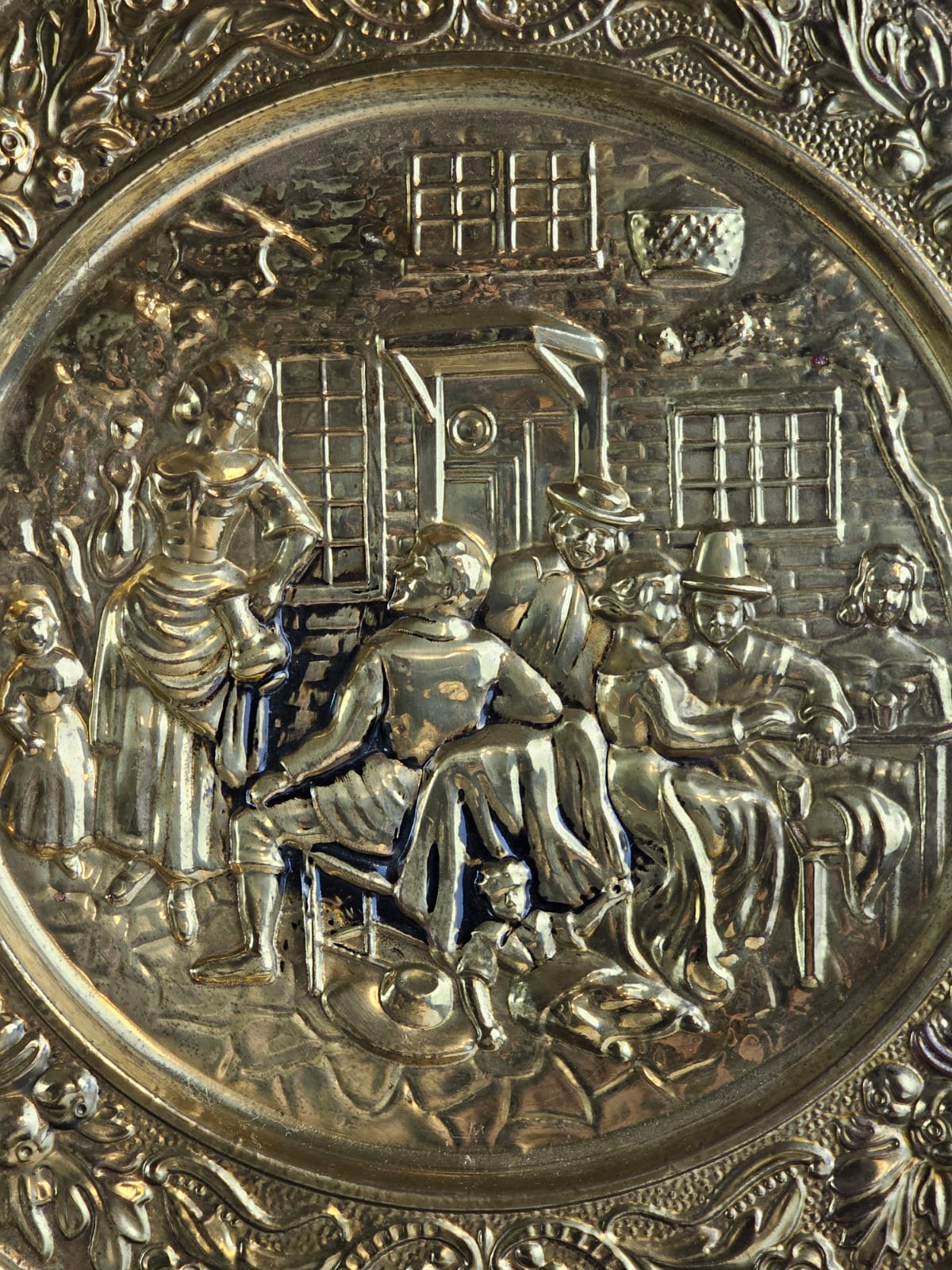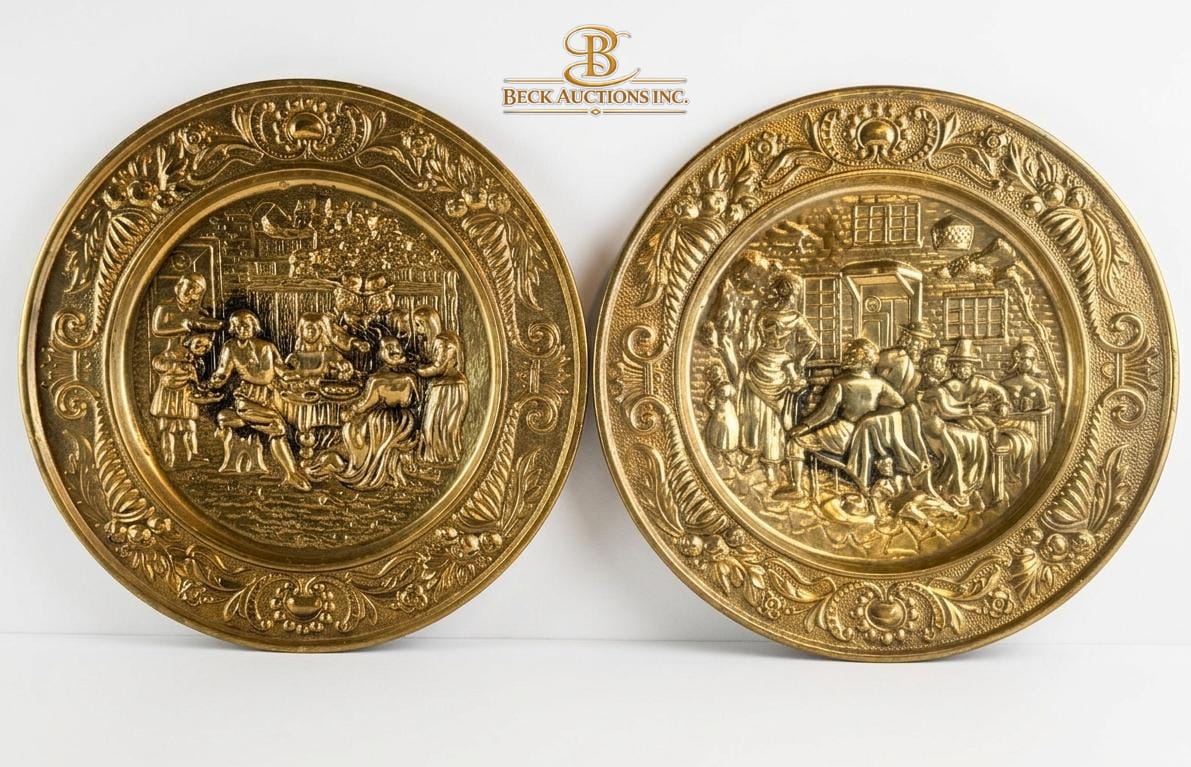Vintage Embossed Brass Wall Plates Detailed Tavern Or Pub Scenes, The Mid-20th Century ENGLAND 14''INCHES WIDTH