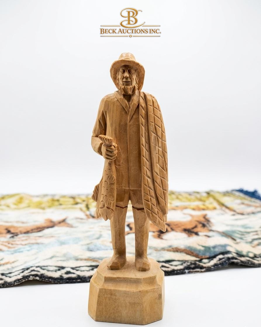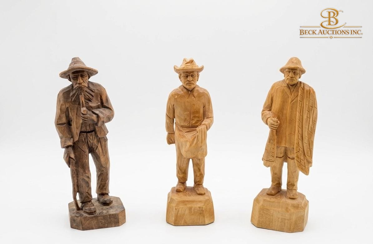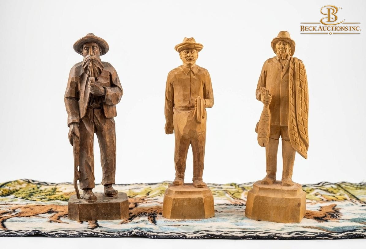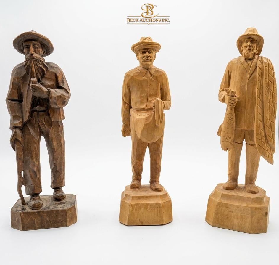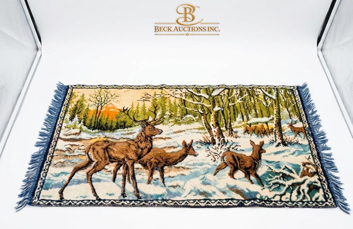 Lot 10 Hand Carved Wooden Sculptures And Italian Art Tapestry Featuring Deer In A Snowy Forest Scene