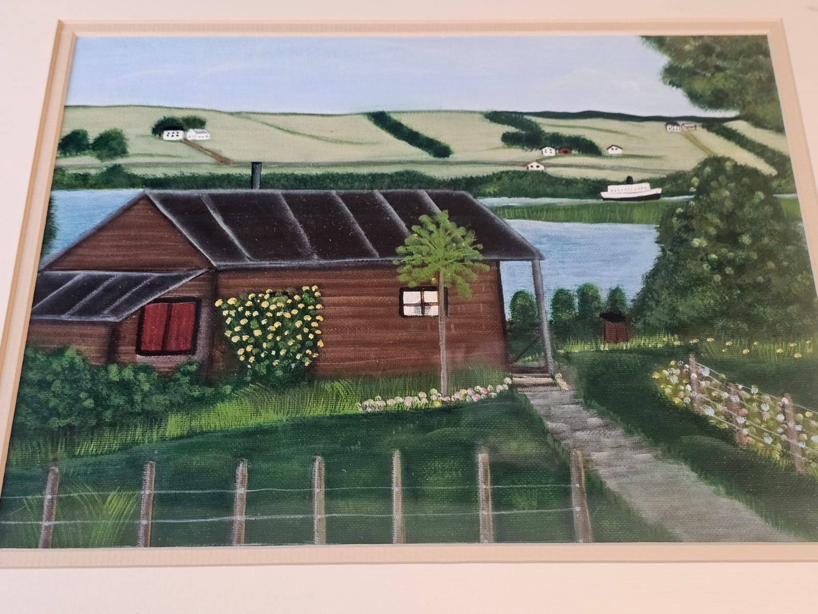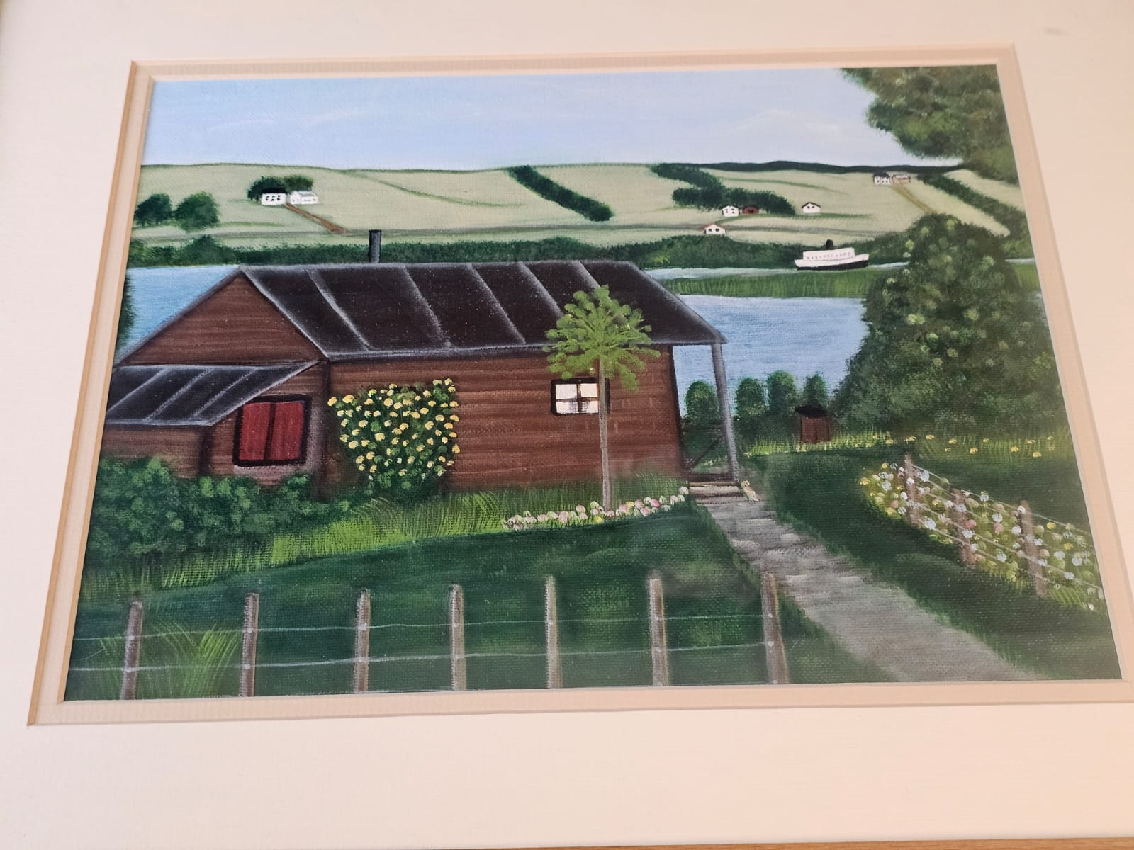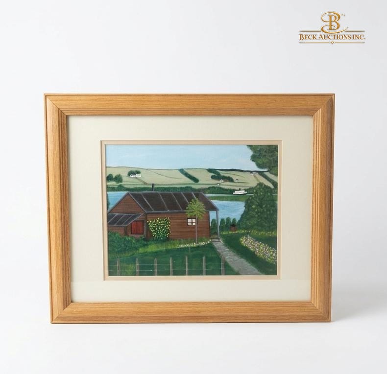 Lot 16 Landscape Painting Featuring A Rustic Wooden Cabin Situated Beside A Lake