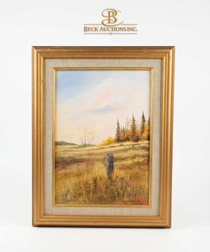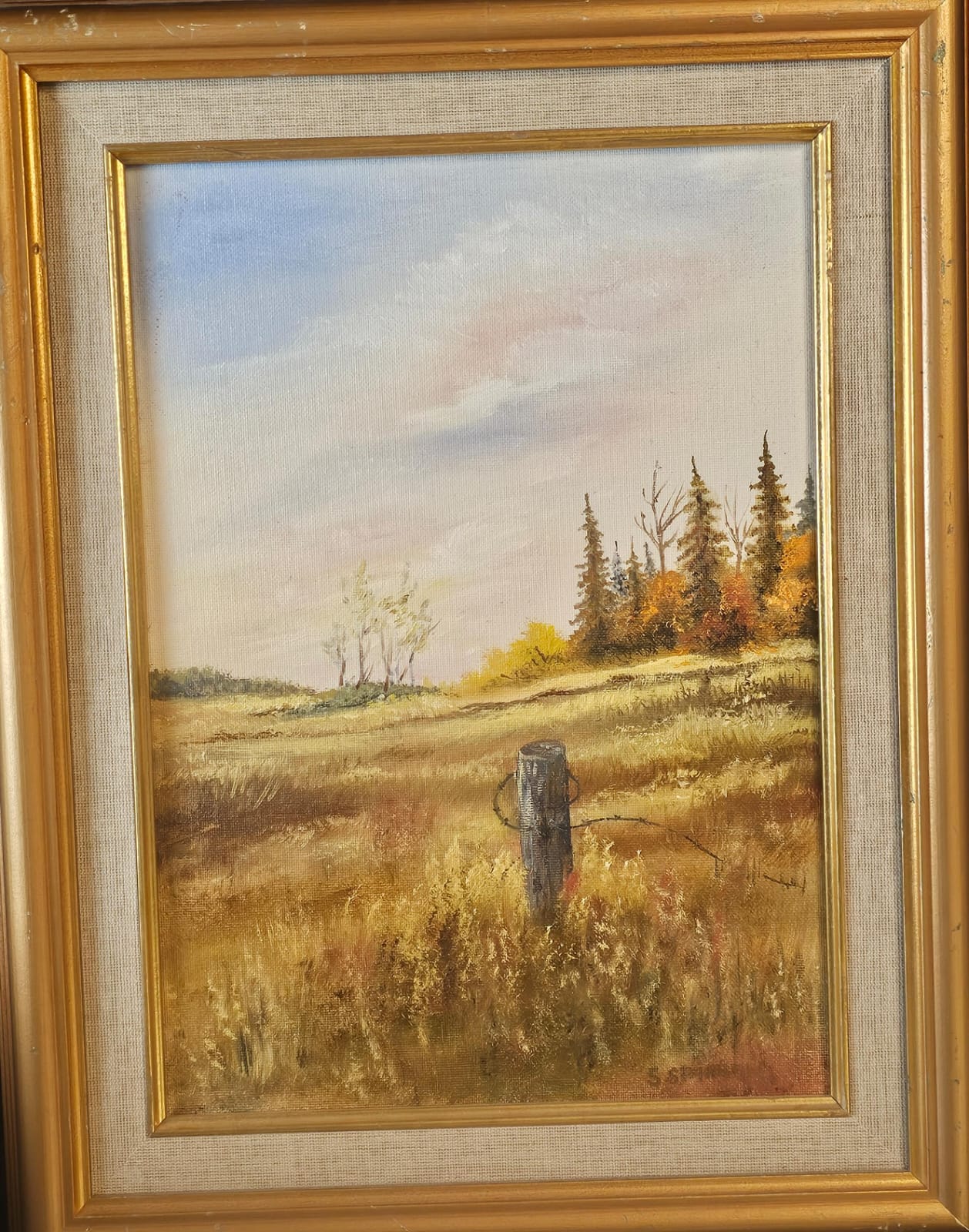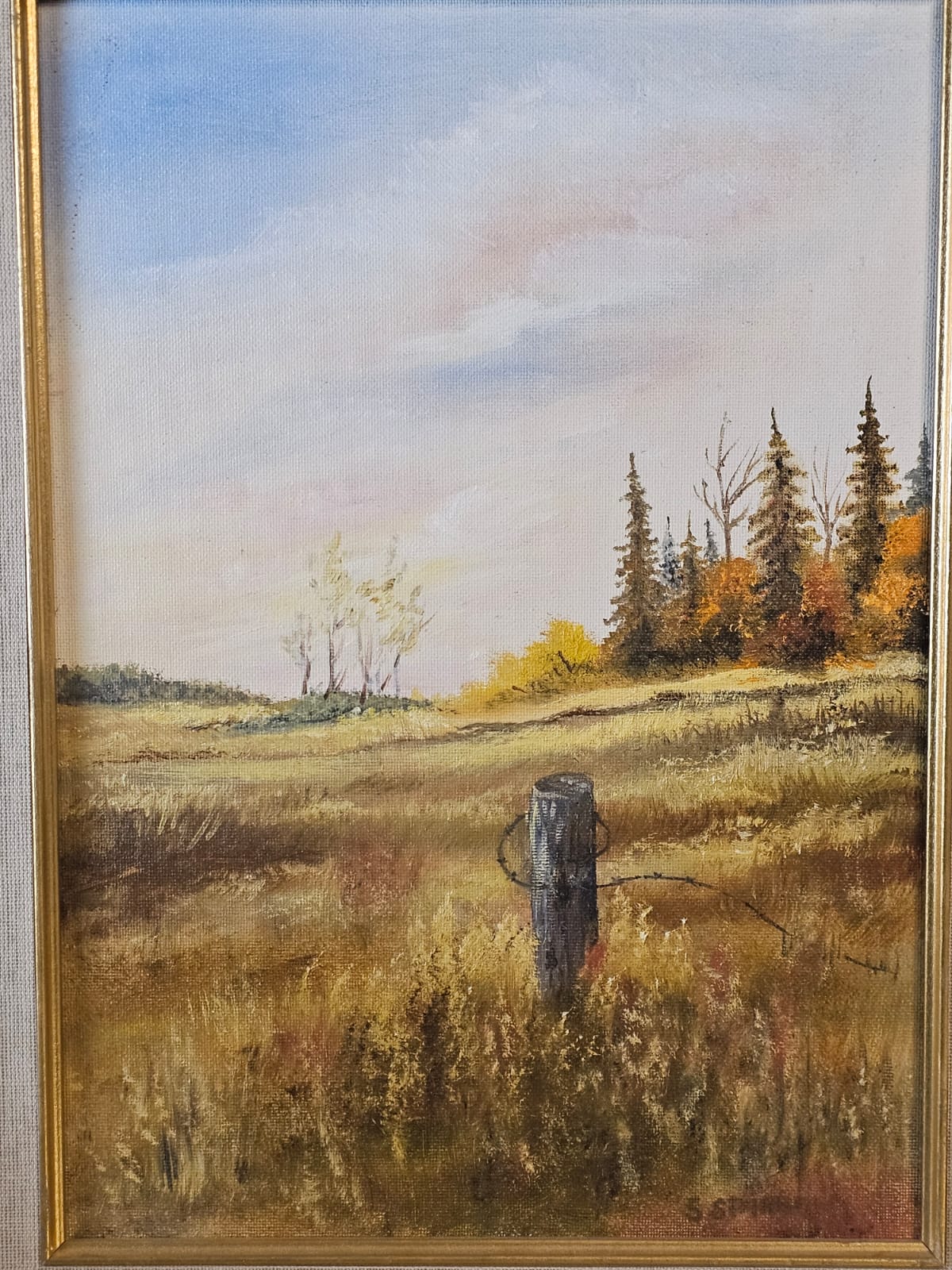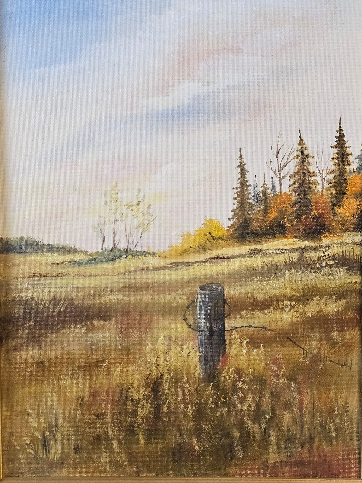 Lot 18 Landscape Painting Featuring A Rustic Wooden Fence Post With Barbed Wire In A Field During Autumn.