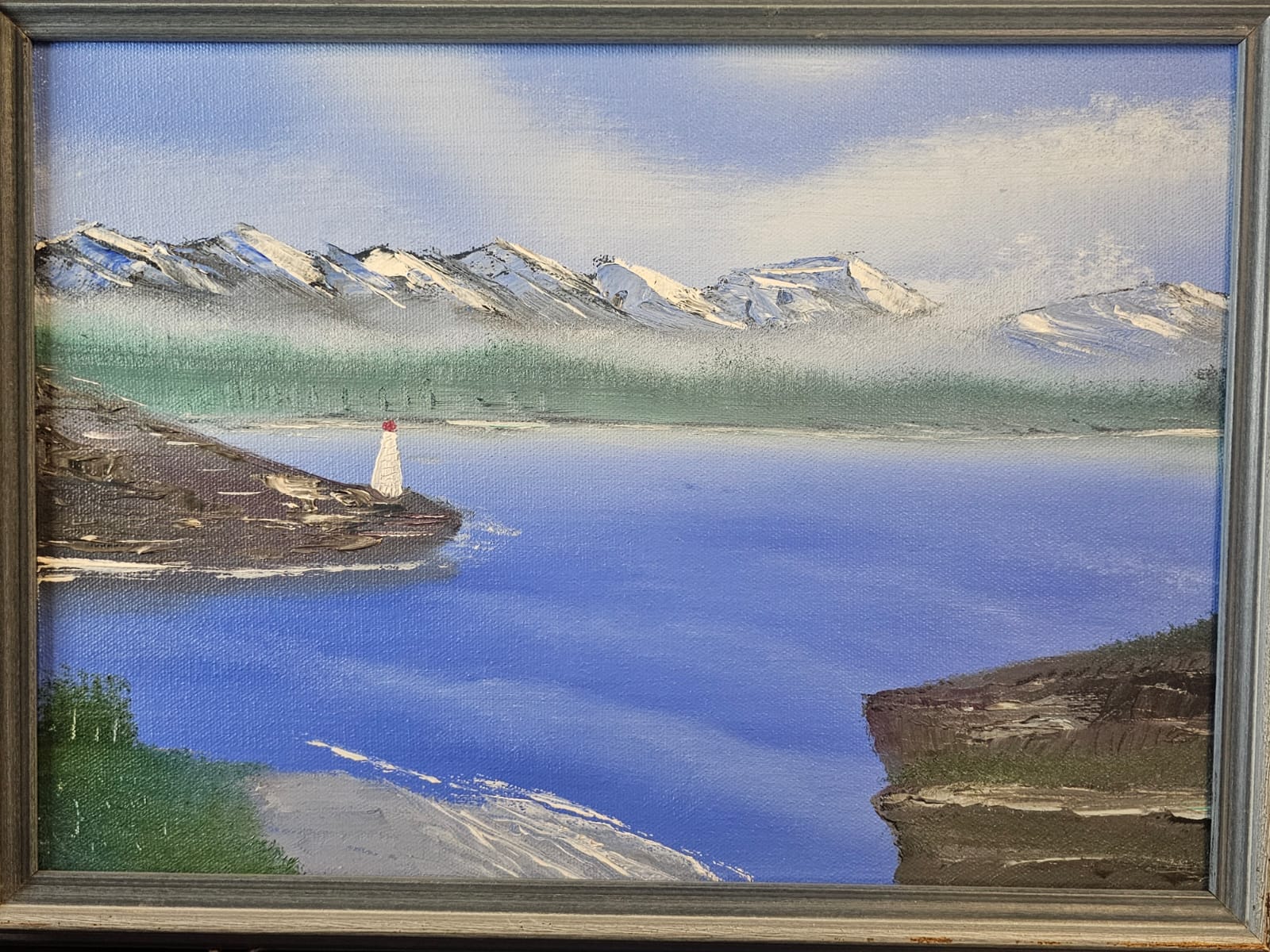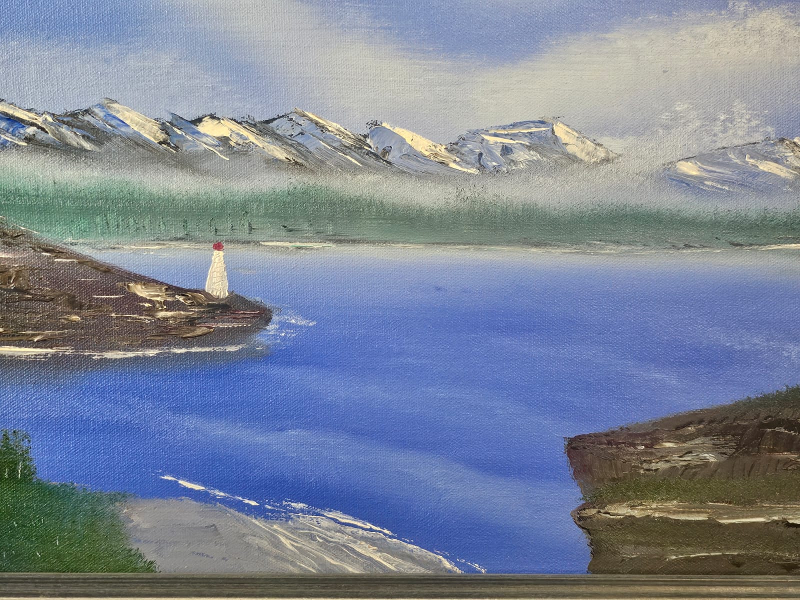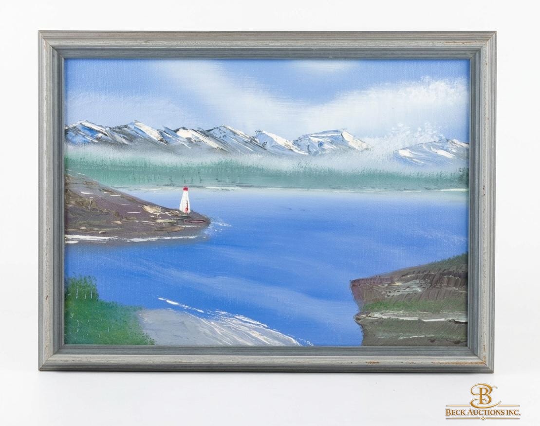 Lot 19 Landscape Painting A Lighthouse Set Against A Backdrop Of Mountains And A Blue Body Of Water 15''*12