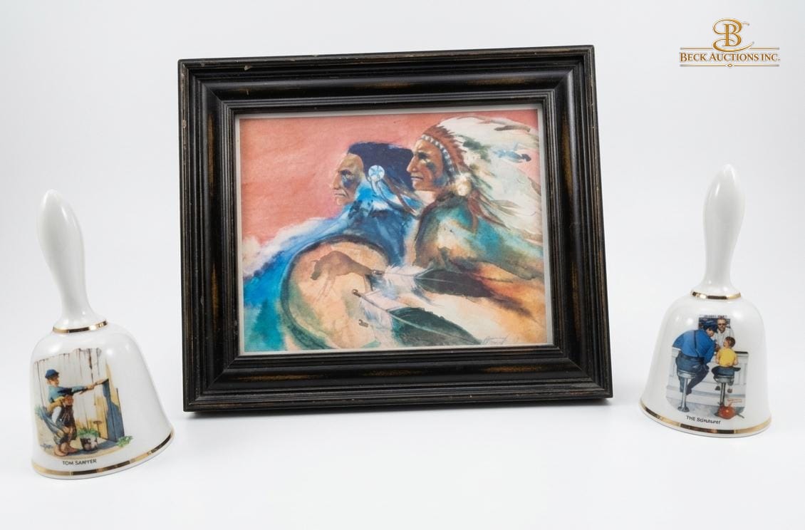 Lot 20 Painting Of Native American Figures , Danbury Mint Porcelain Collector Bell By Norman Rockwell.