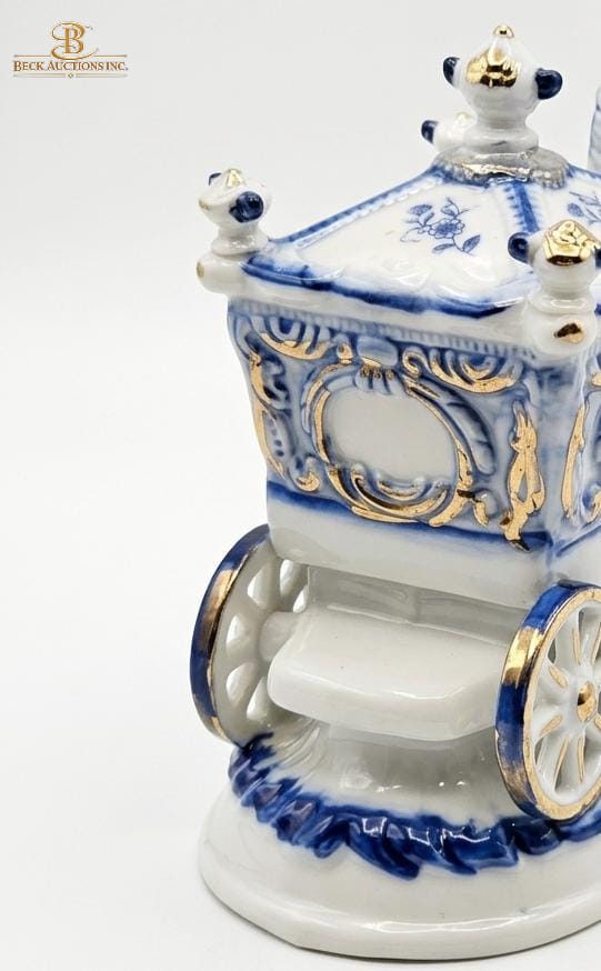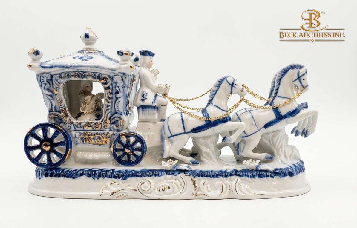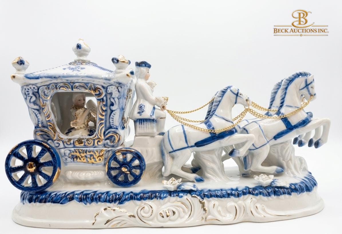 Lot 27 Porcelain Figurine Of Victorian Royal Carriage With Two Horses A Coachman & A Princess Figure Inside