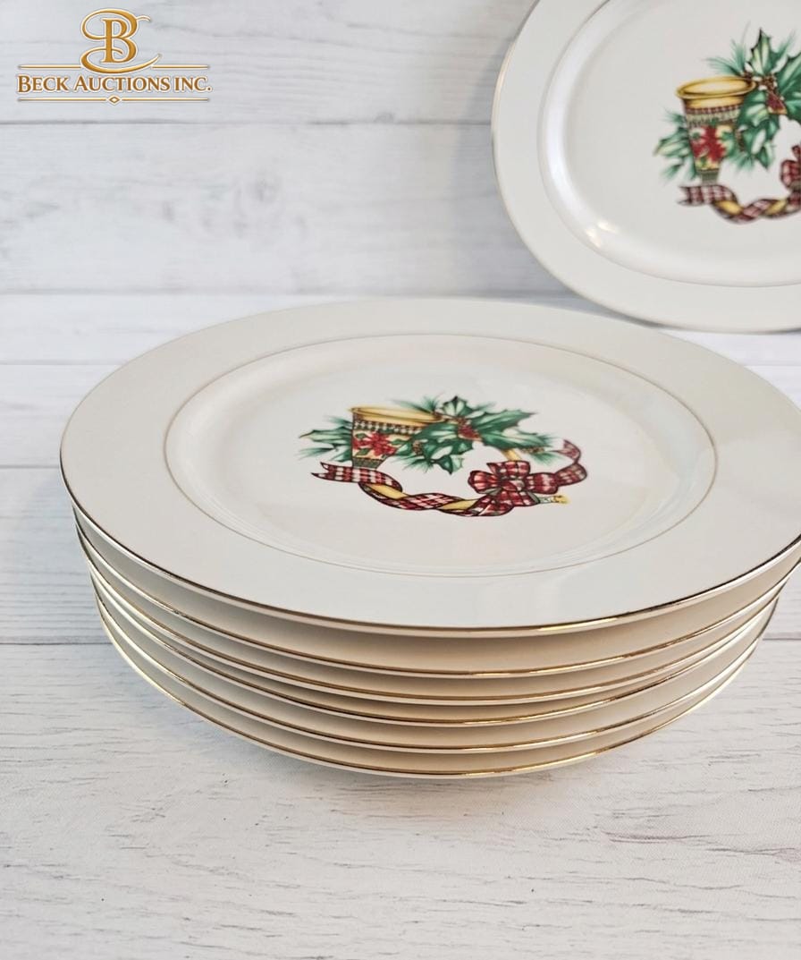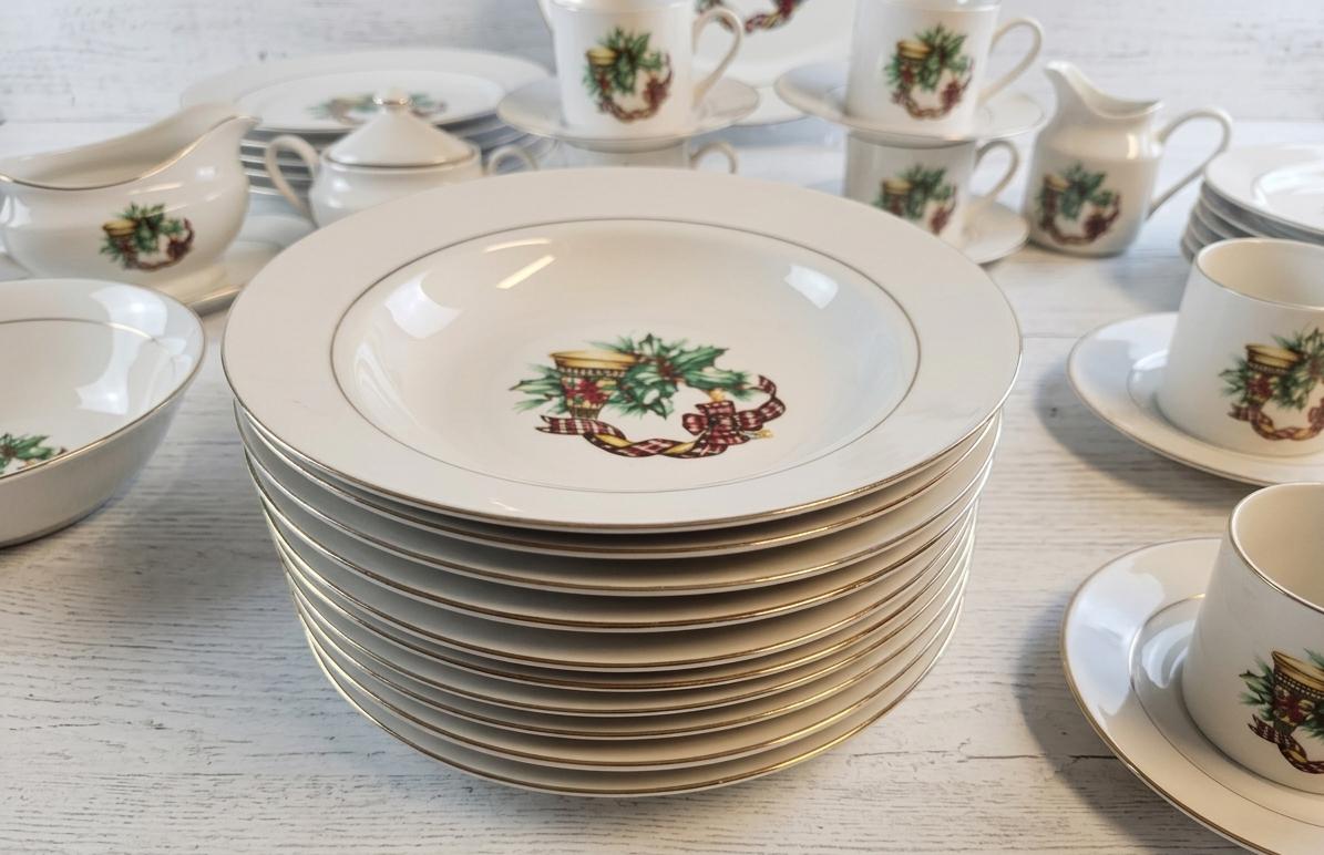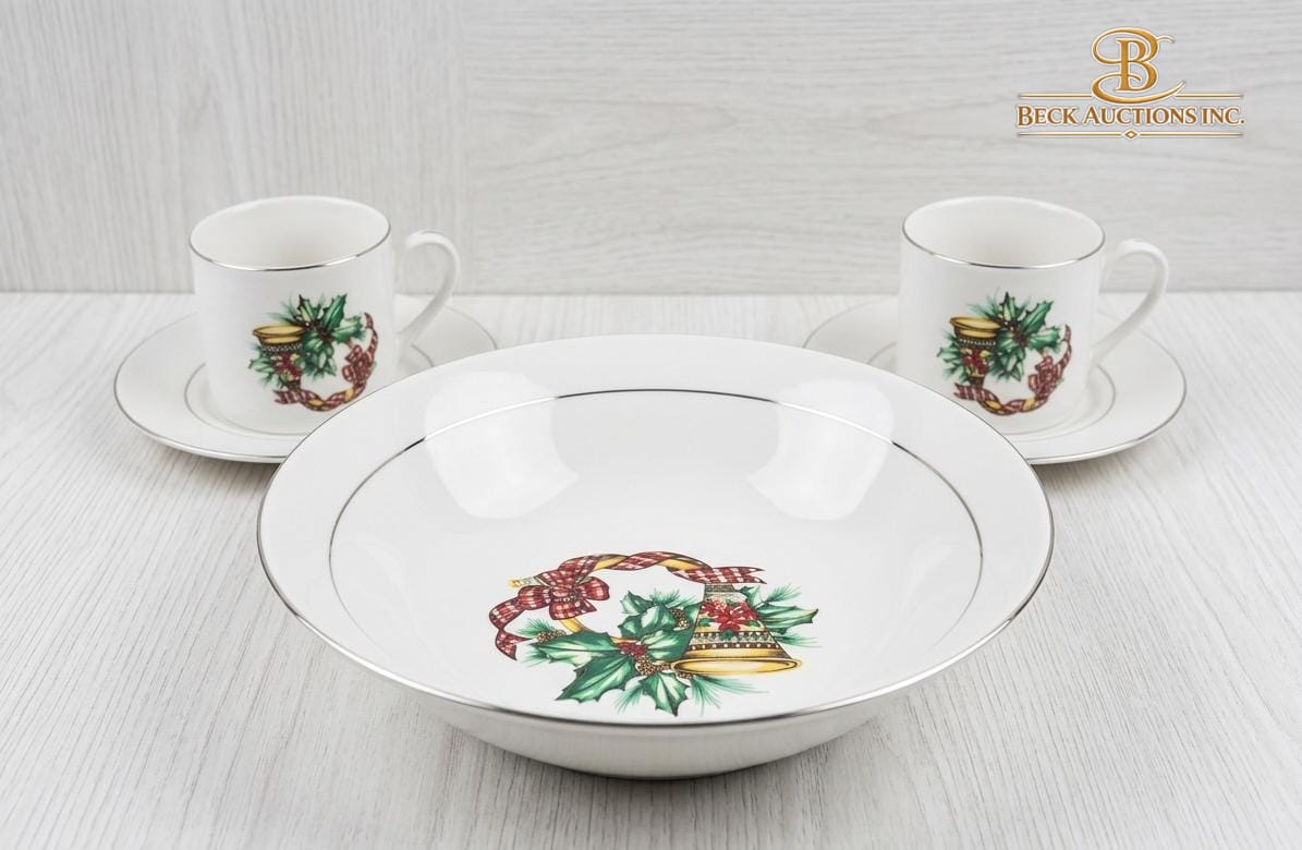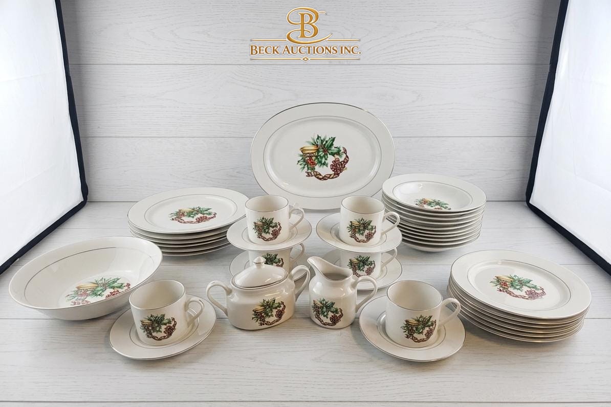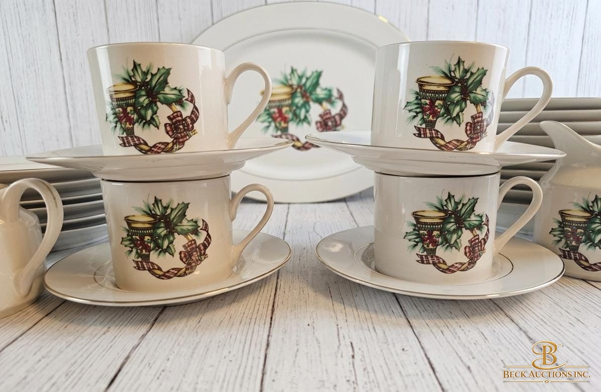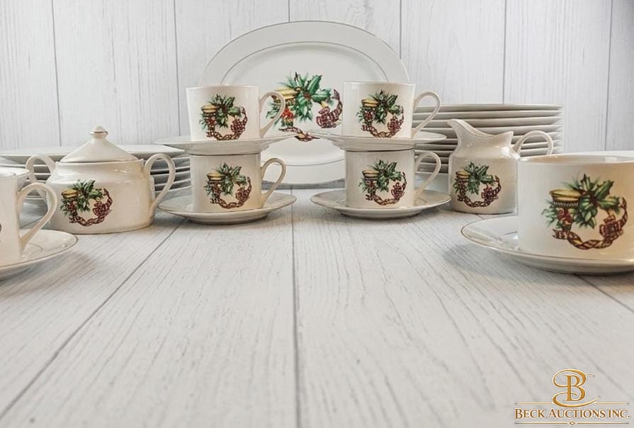 Lot 33 Vintage Tea Set Decorated With A Festive Holly & Berry Cups Saucers A Covered Sugar Bowl & A Creamer