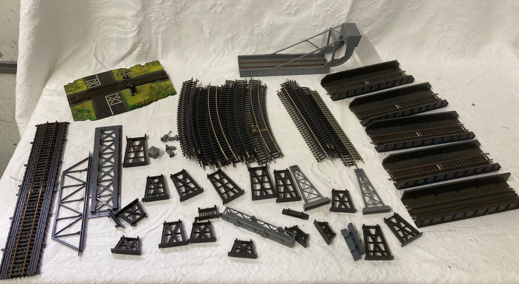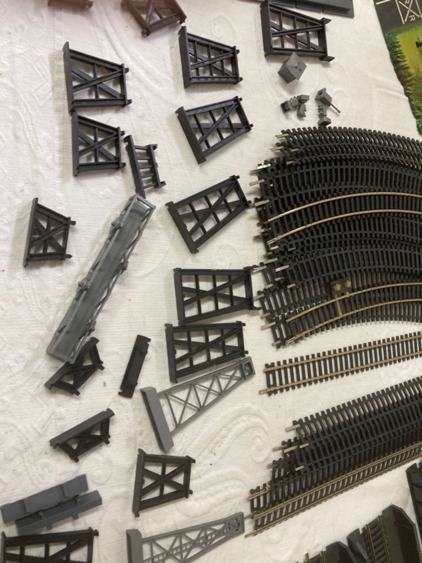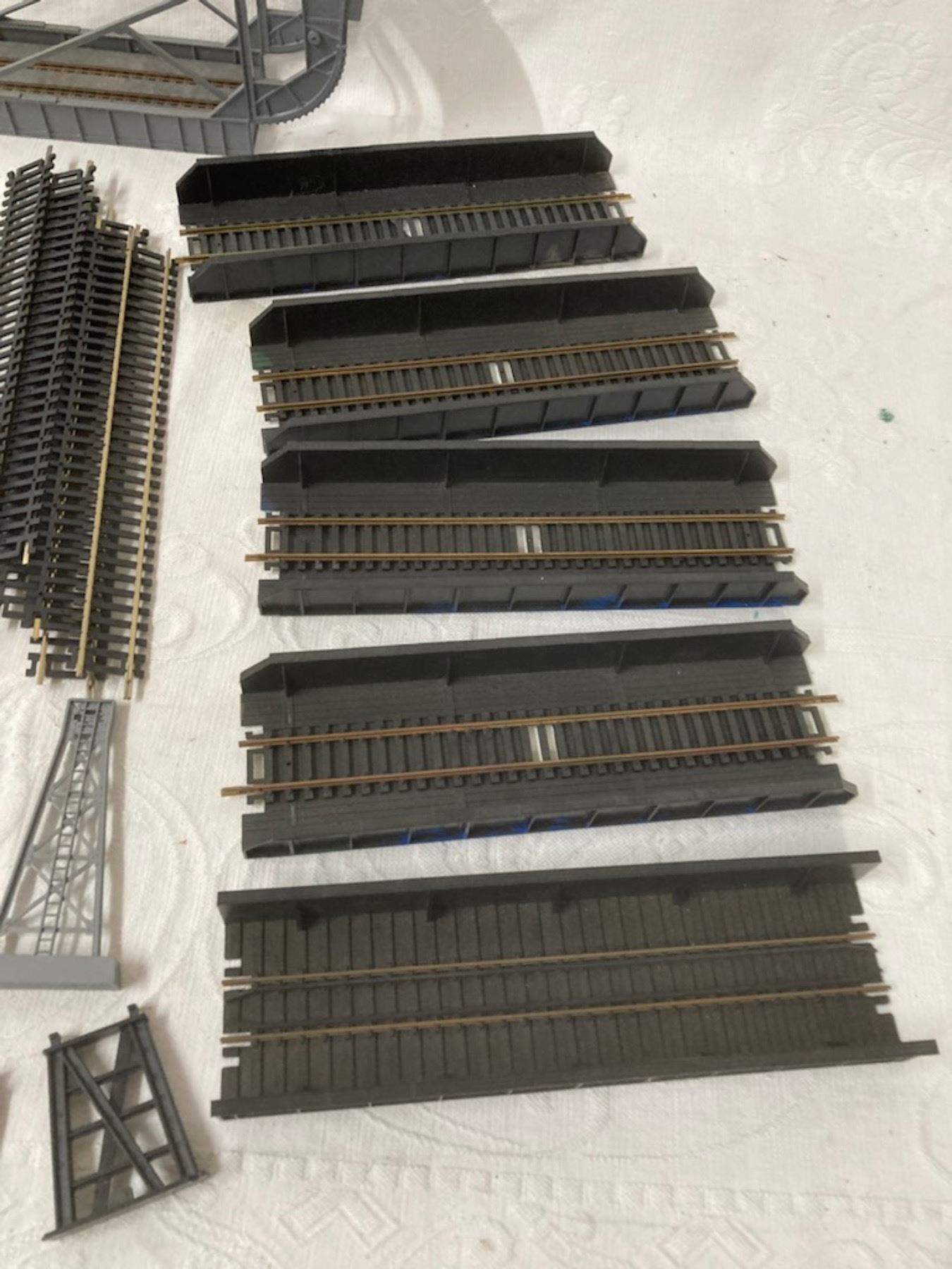 INCLUDES STRAIGHT AND CURVED TRACK SECTIONS, VARIOUS BRIDGE STRUCTURES, TRESTLE SUPPORTS, AND A CROSSING PIECE