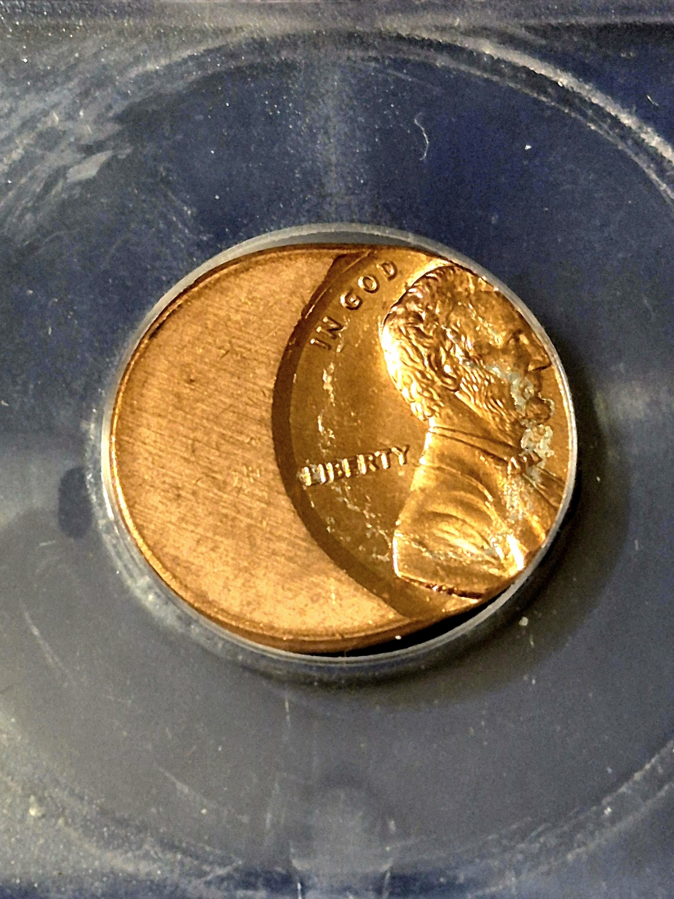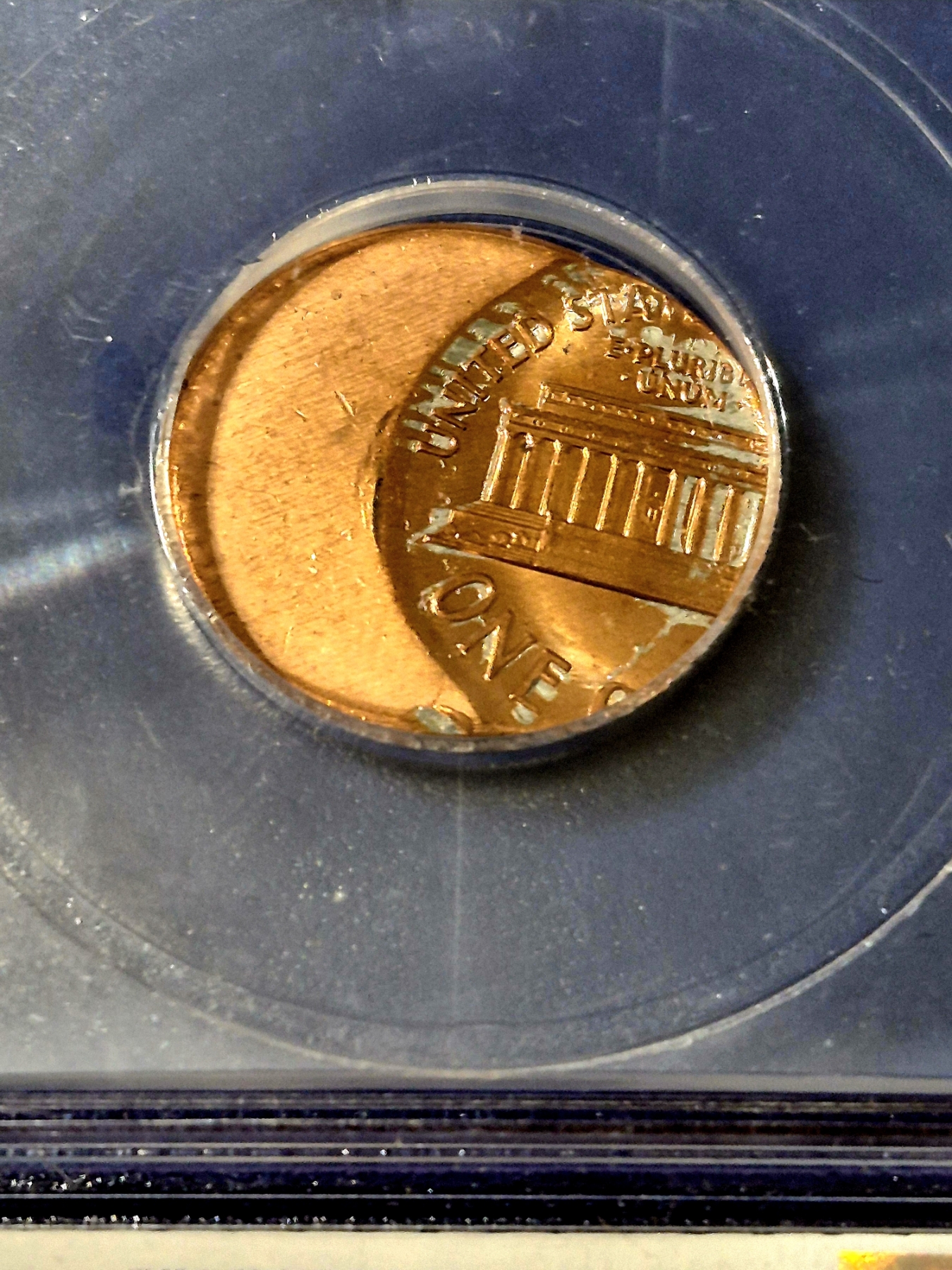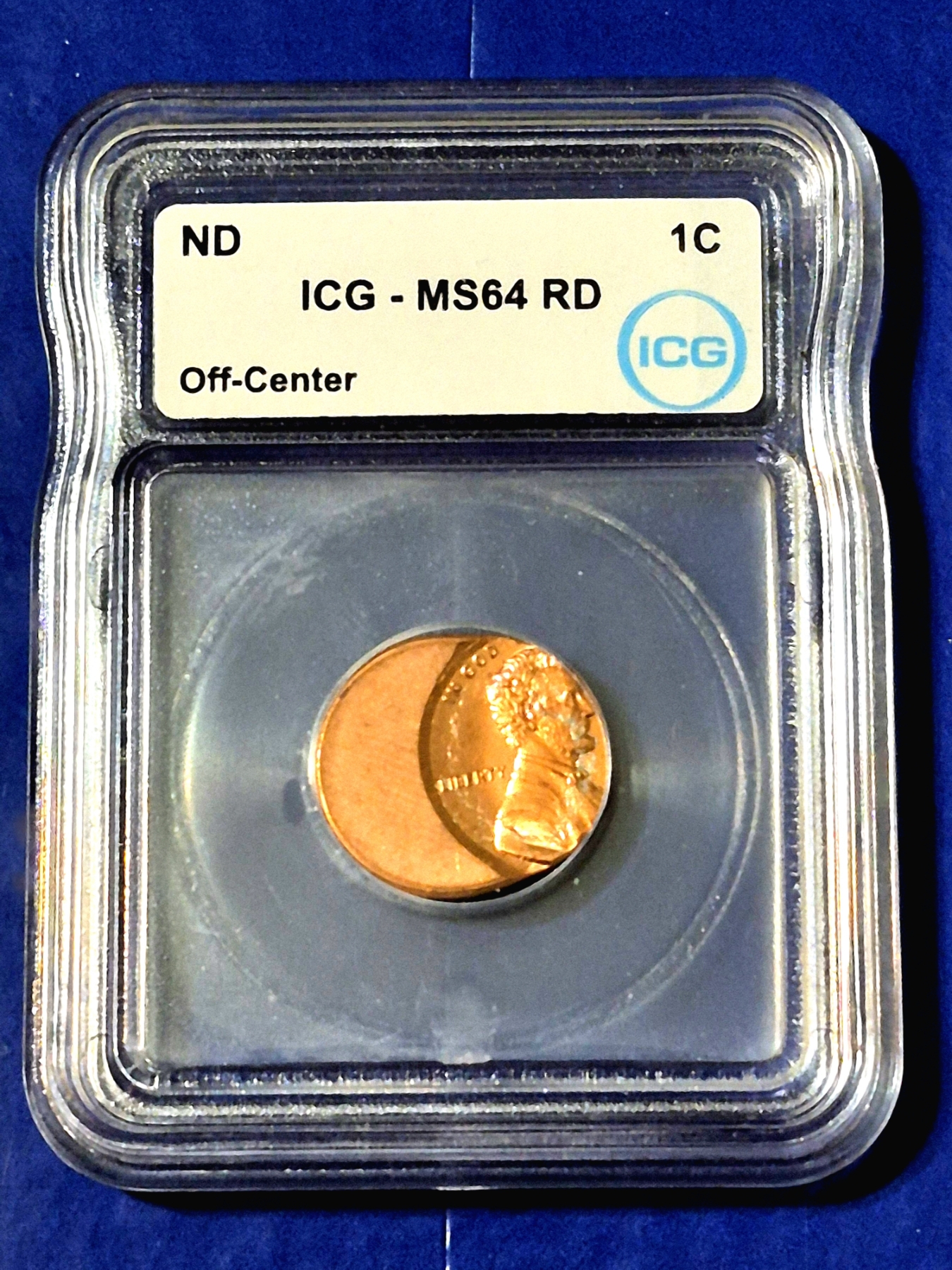RARE ERROR CENT - GRADED MS64 RD BY ICG - LINCOLN MEMORIAL CENT OFF CENTER PLANCHET CUT ERROR - A VERY BOLD STANDOUT IN THIS GRADED AND ENCAPSULATED EXAMPLE WITHOUT DATE, AS IN THE WAY IT WAS STAMPED AND CUT OUT, THE DATE CANNOT BE DETERMINED, HOWEVER THIS IS CLEARLY OF THE MODERN LINCOLN MEMORIAL TYPES WHICH COMMENCED MINTAGE IN 1959 - COLLECTORS OF BOLD ERRORS SUCH AS THIS, TAKE ADVANTAGE NOW.