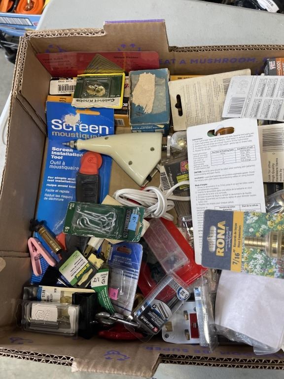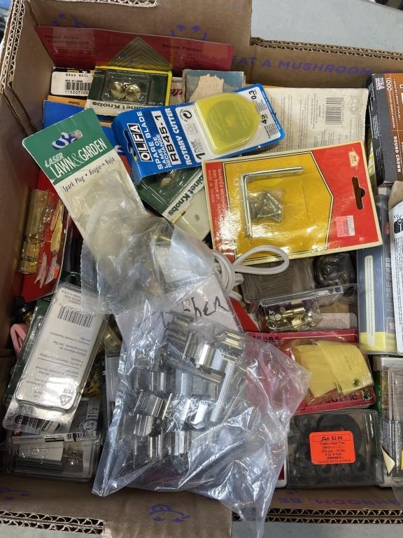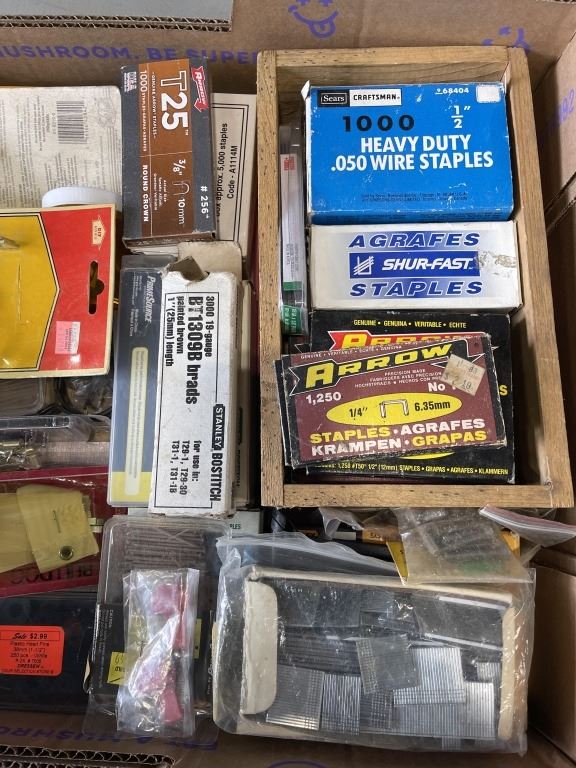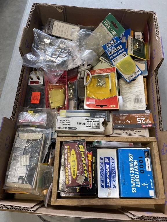 Lot 55 TRAY OF SHOP SUPPLIES INCLUDING SPARK PLUGS STAPLES, ROTARY CUTTER BLADES