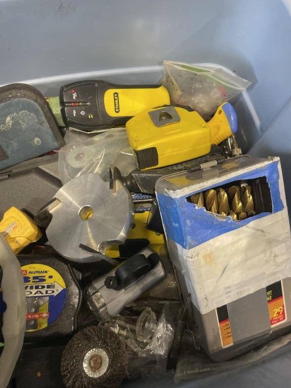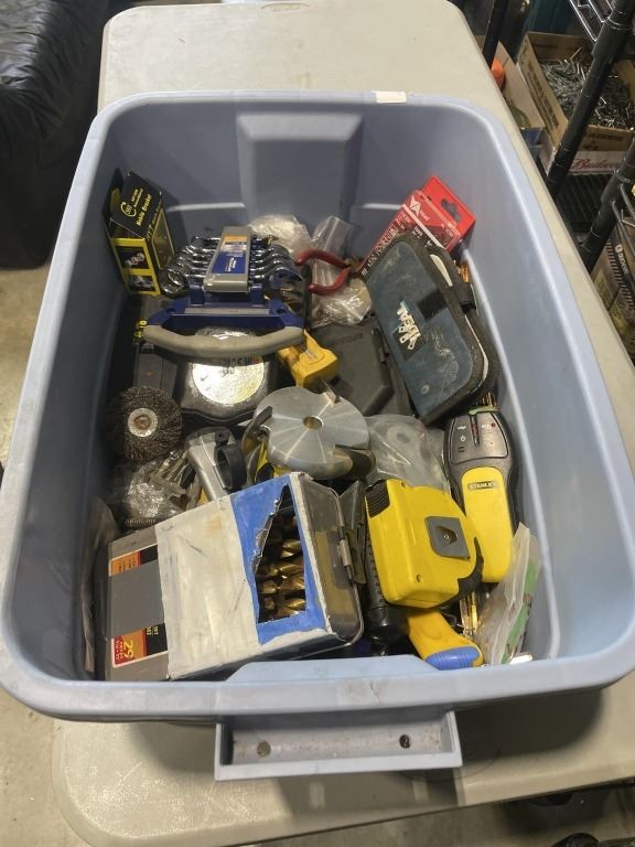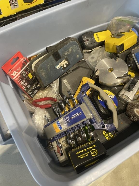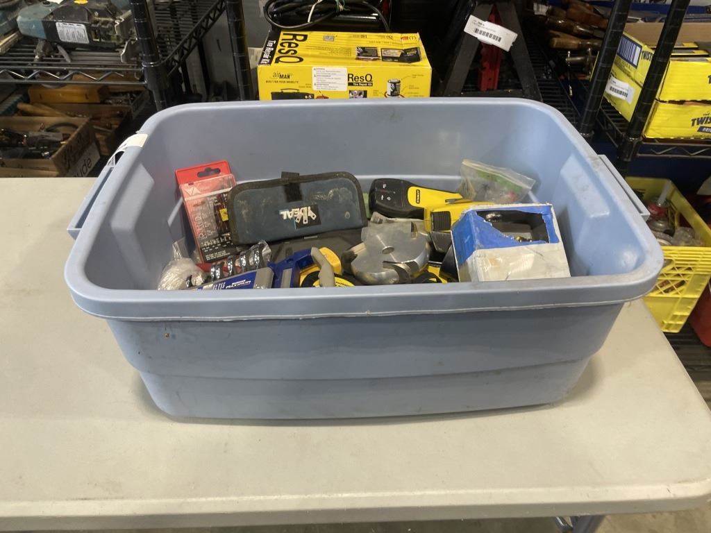 Lot 120 TOTE OF ASSORTED HAND TOOLS AND SHOP SUPPLY