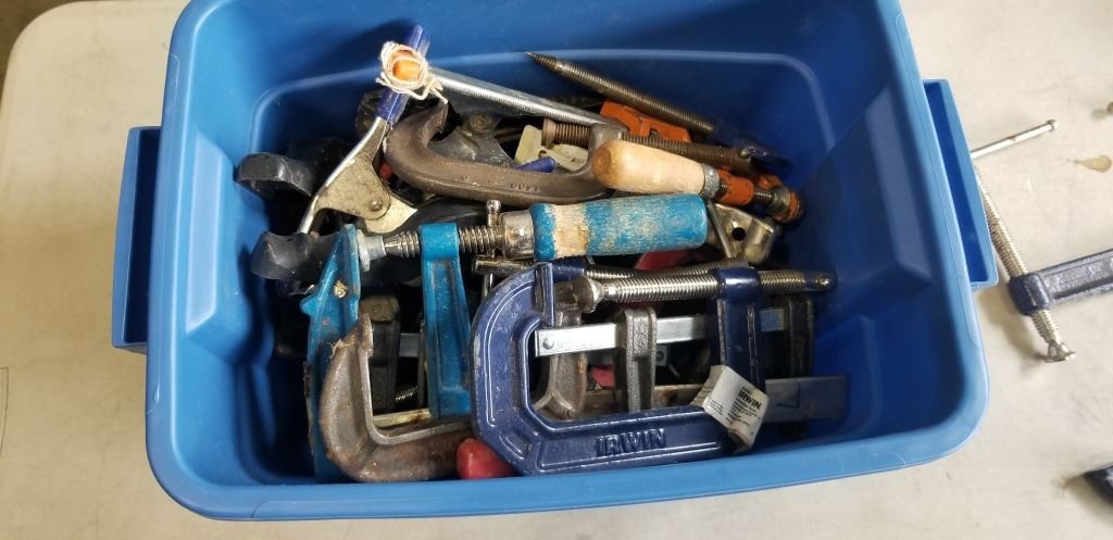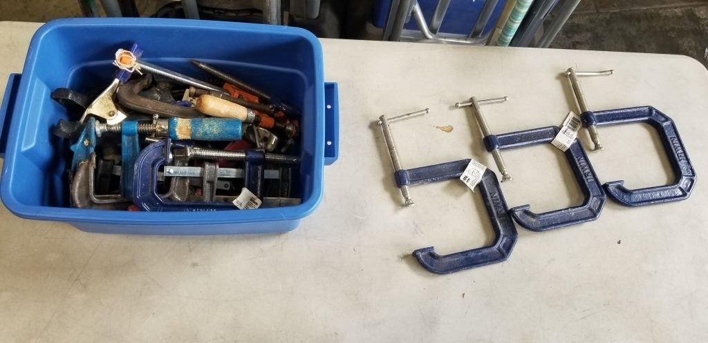Lot 163 TOTE OF SMALL CLAMPS AND 3 IRWIN 3 INCH WIDE MOUHT CLAMPS