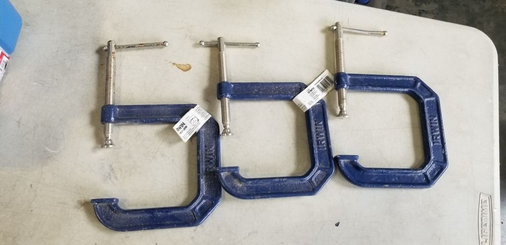 TOTE OF SMALL CLAMPS AND 3 IRWIN 3 INCH WIDE MOUHT CLAMPS