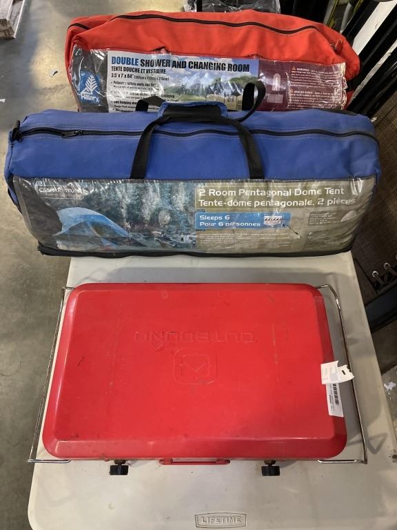 2 ROOMDOME TENT, SHOWER AND CHANGE ROOM TENT, AND PORTABLE CAMP STOVE