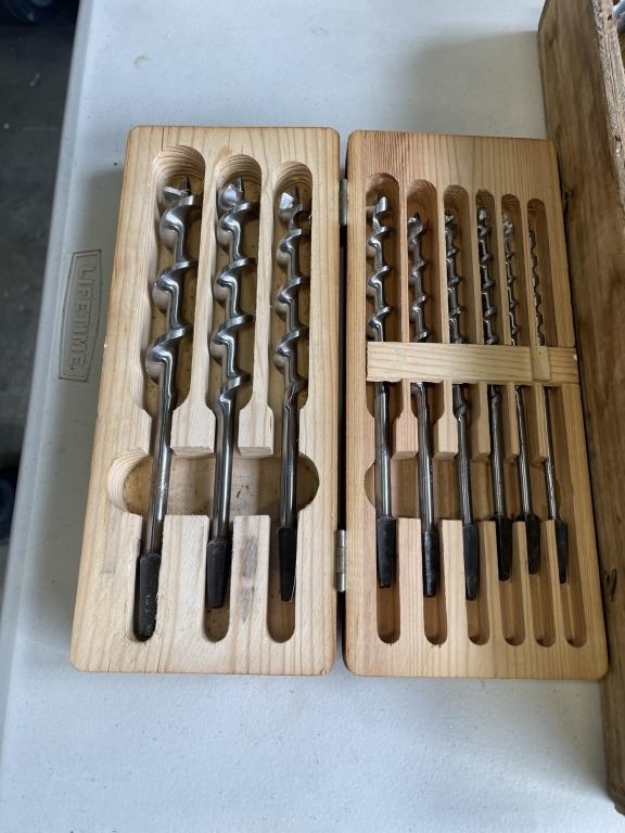CASED SWEDISH AUGER BITS, AND TRAY OF ASSORTED DRILL BITS AND HOLE SAWS