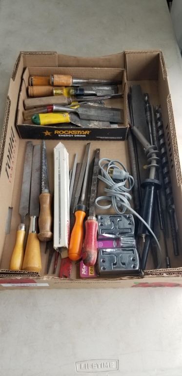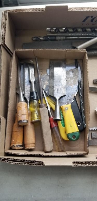 TRAY OF SHOP FILES, CHISELS, DRILL BITS