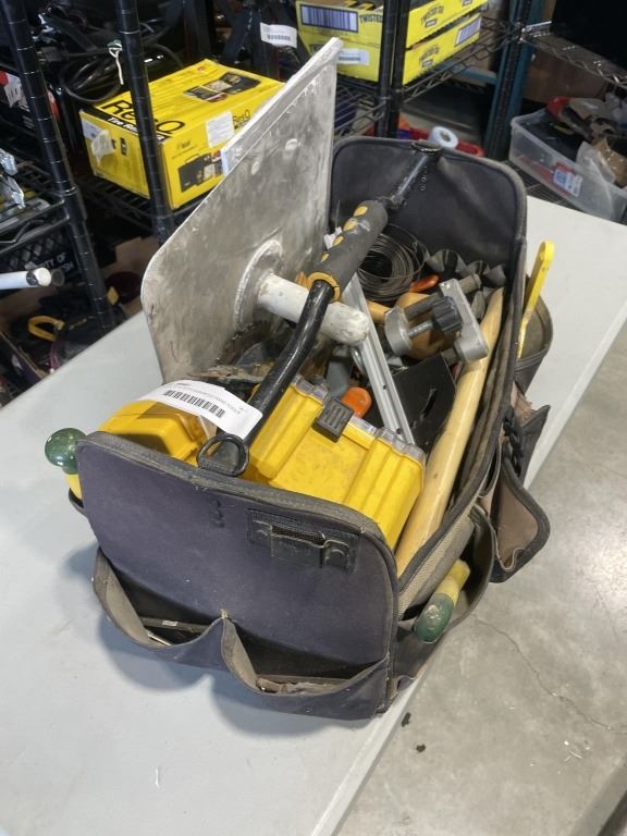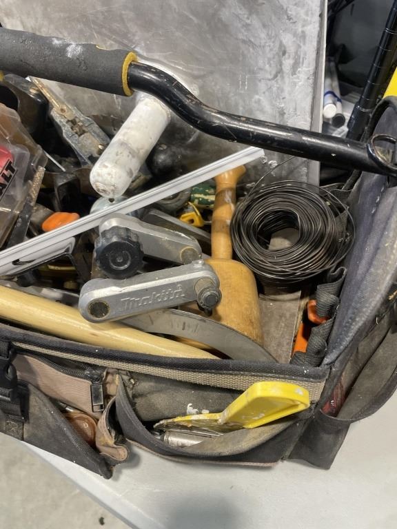 Lot 236 TOOL TOTE WITH ASSORTED HAND TOOLS AND STILETTO HAMMER HANDLE