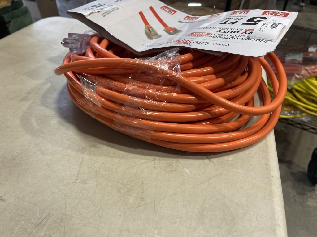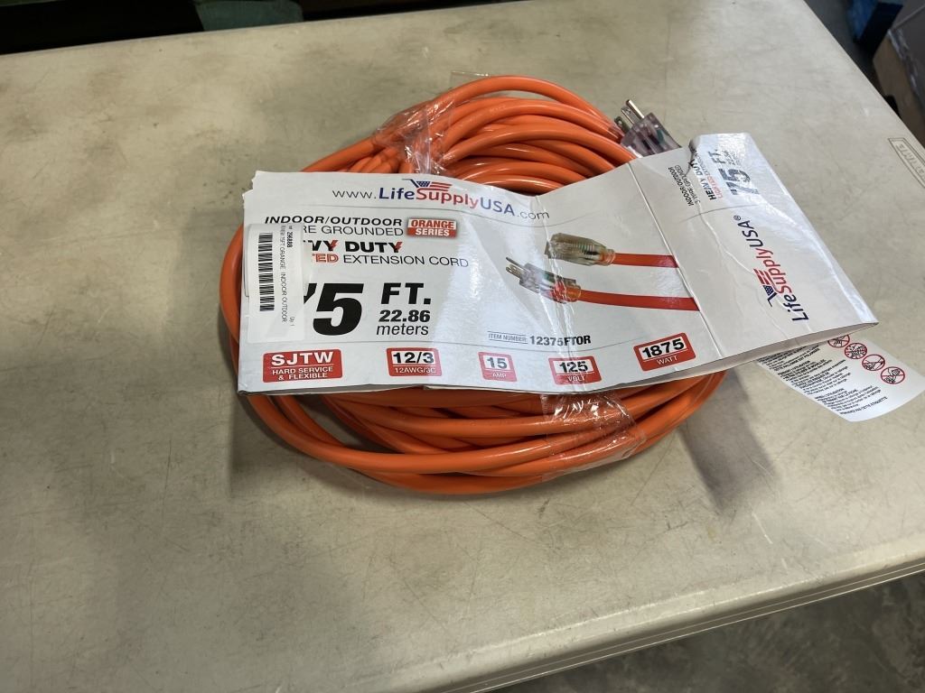 Lot 247 AS NEW 75FT ORANGE INDOOR OUTDOOR HEAVY DUTY LIGHTED 3 WIRE GROUNDED EXTENSION CORD 12AWG