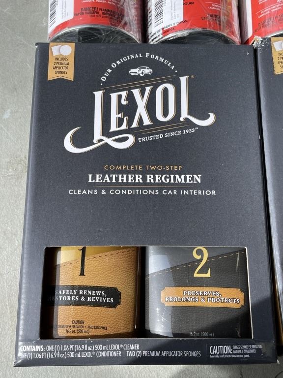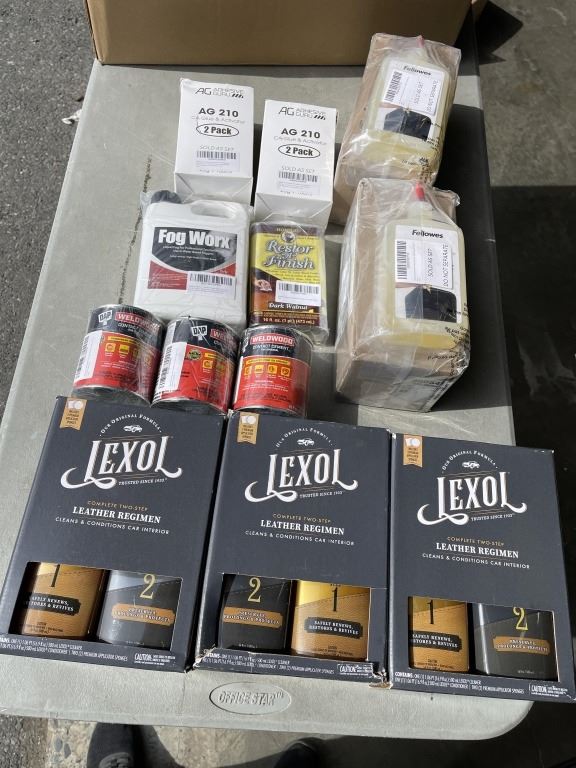 Lot 294 NEW AMAZON OVERSTOCK ITEMS INCULDING CONTACT CEMENT 2 STEP LEATHER CLEANER SETS FOR INTERIOR AND AG