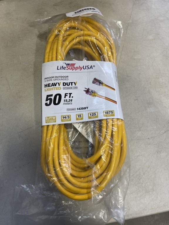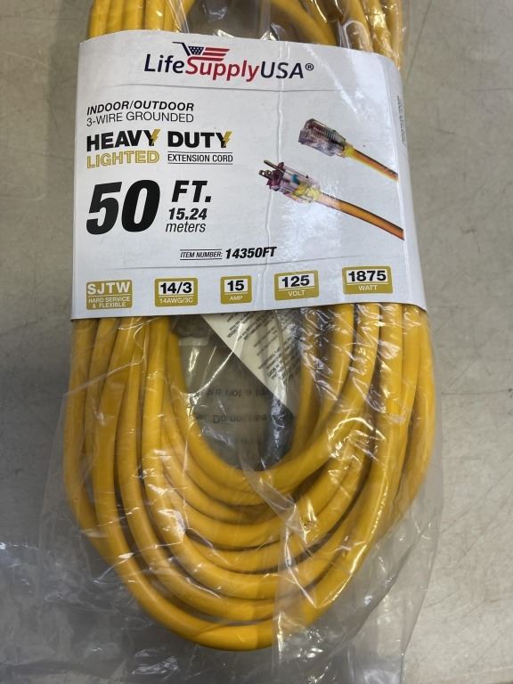 AS NEW 50FT YELLOW INDOOR OUTDOOR HEAVY DUTY LIGHTED 3 WIRE GROUNDED EXTENSION CORD 14AWG