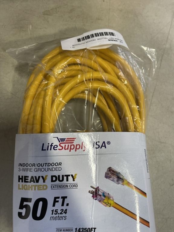 Lot 377 AS NEW 50FT YELLOW INDOOR OUTDOOR HEAVY DUTY LIGHTED 3 WIRE GROUNDED EXTENSION CORD 14AWG