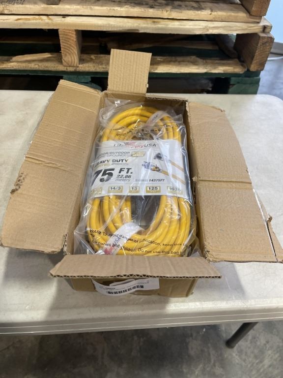 Lot 378 AS NEW 75FT YELLOW INDOOR OUTDOOR HEAVY DUTY LIGHTED 3 WIRE GROUNDED EXTENSION CORD 14AWG