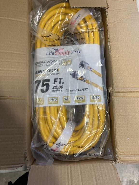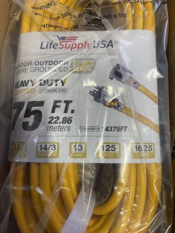 AS NEW 75FT YELLOW INDOOR OUTDOOR HEAVY DUTY LIGHTED 3 WIRE GROUNDED EXTENSION CORD 14AWG
