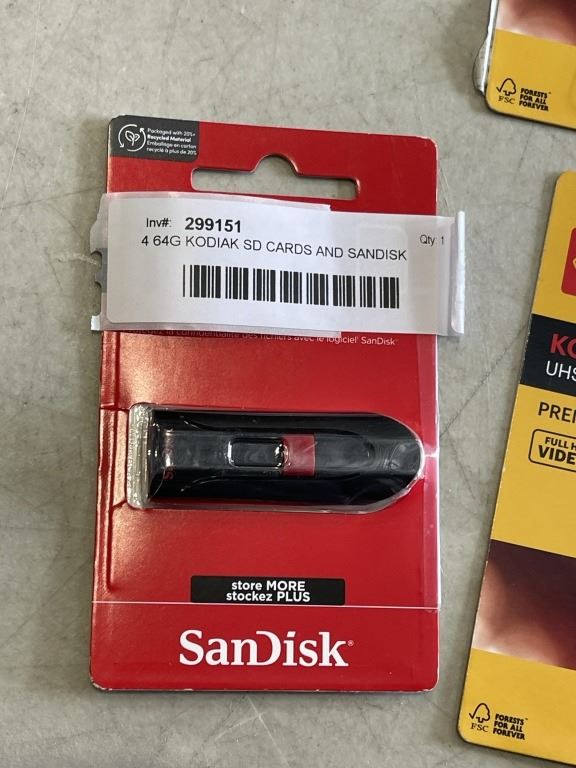 Lot 394 4 64G KODIAK SD CARDS AND SANDISK CRUZER FLASH DRIVE