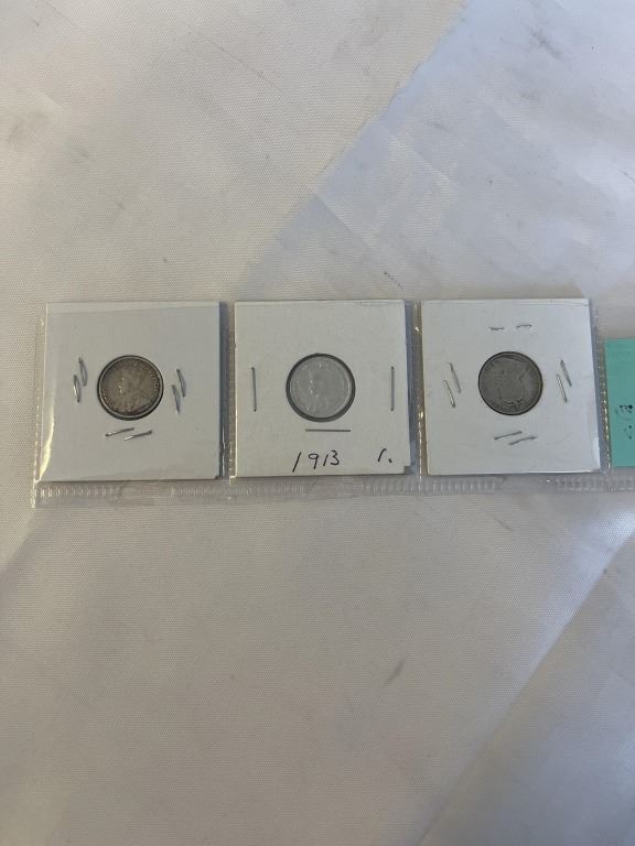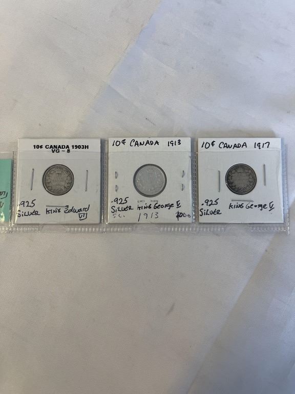 Lot 405 3 CANADIAN SILVER 10 CENT 1903 EDWARD VII, 1913 AND 1917 .925 SILVER