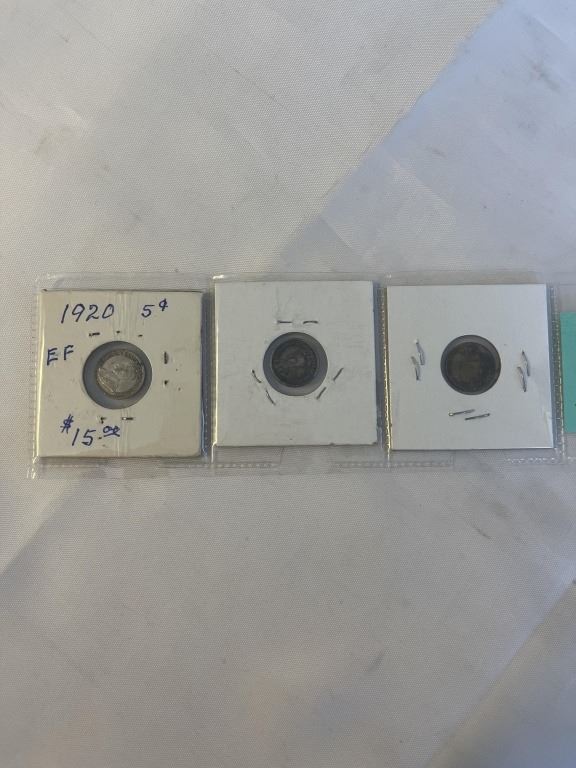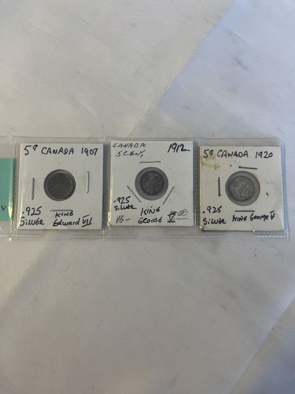 Lot 411 3 CANADIAN SMALL 5 CENTS, 1907 EDWARD VII, 1912 AND 1920 GEORGE V