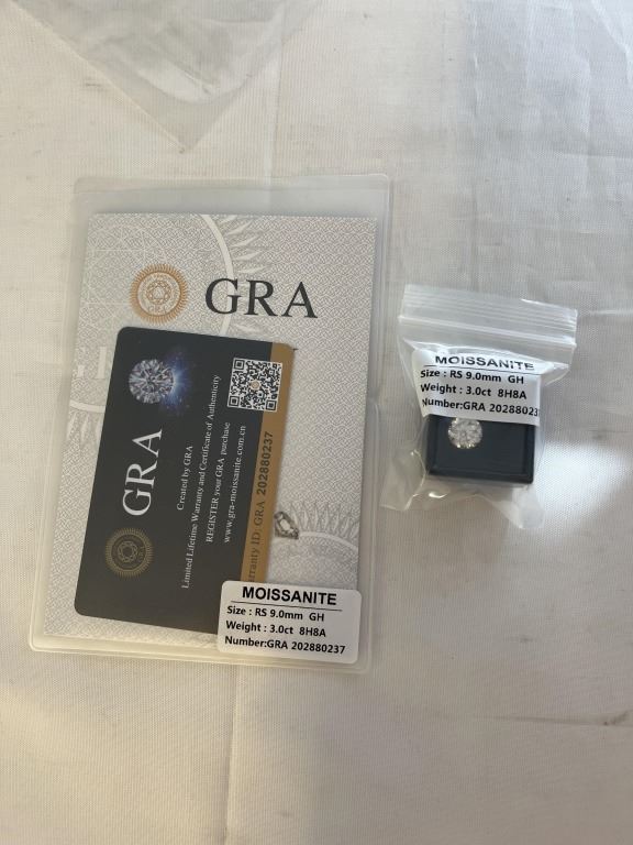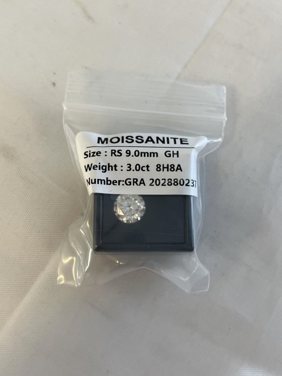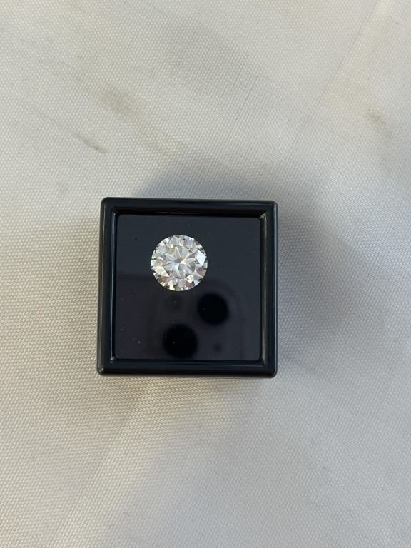 Lot 423 NEW 3.0 CARAT MOISSANITE STONE, ROUND BRILLIANT CUT, GH-VVS1, GRA REPORT, TESTS POSITIVE W/ DIAMOND