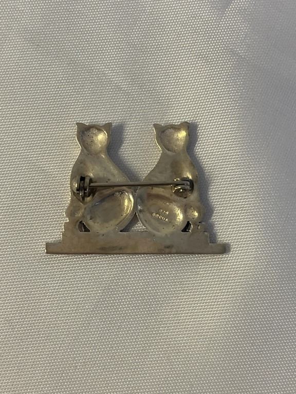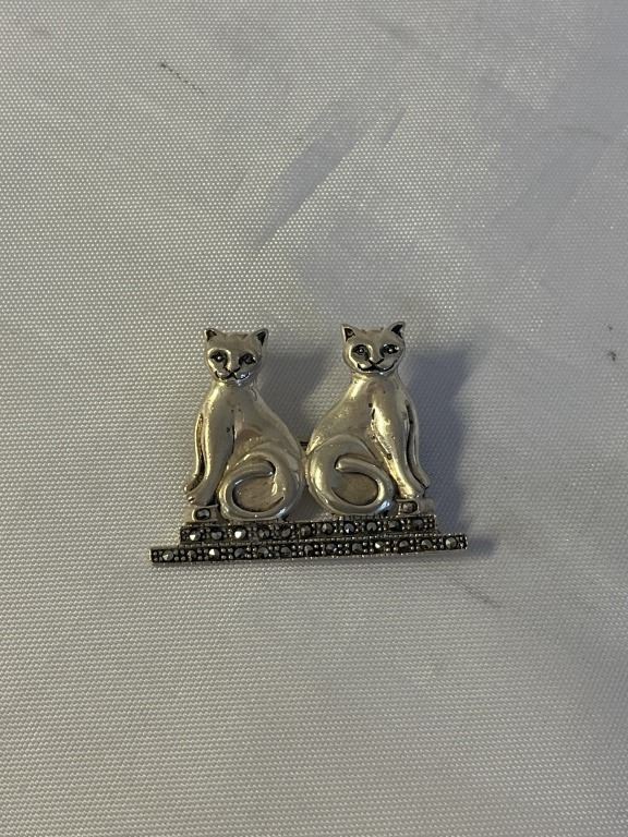 Lot 449 VINTAGE STERLING SILVER W/ MARKASITE STONES TWIN CATS BROOCH MARKED 925 BOMA