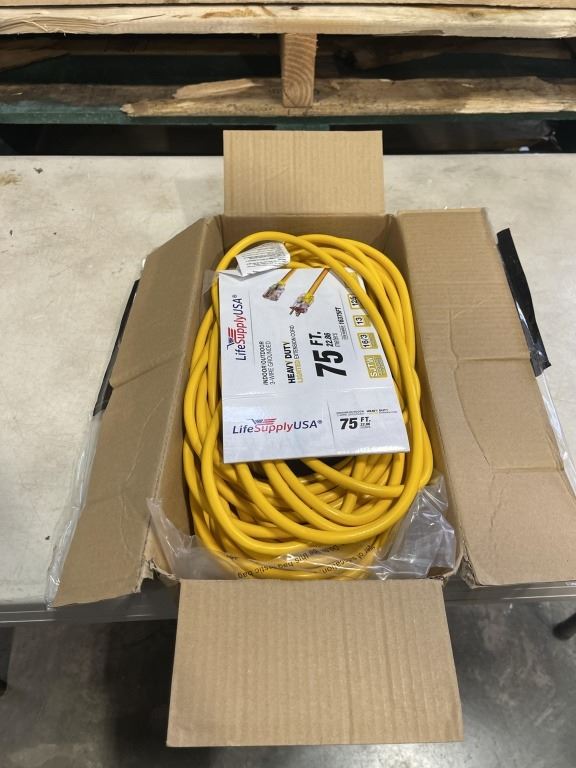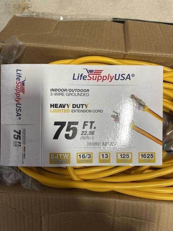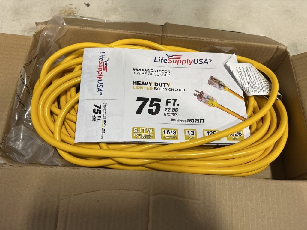 AS NEW 75FT YELLOW INDOOR OUTDOOR HEAVY DUTY LIGHTED 3 WIRE GROUNDED EXTENSION CORD 16AWG
