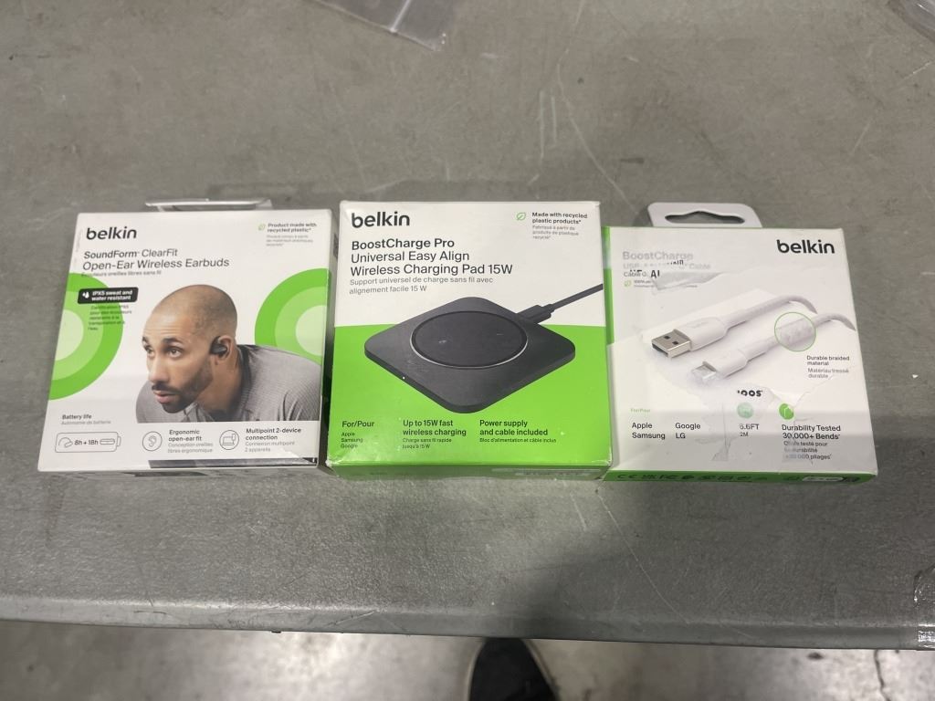 BELKIN BOOSTCHARGE PRO UNIVERSAL EASY ALIGN WIRELESS CHARGIN PAD 15W, BELKIN SOUNDFORM CLEAR FIT OPE EAR WIRELESS EARBUDS AND BELKIN BOOSTCHARGE USB-A TO TYPE C