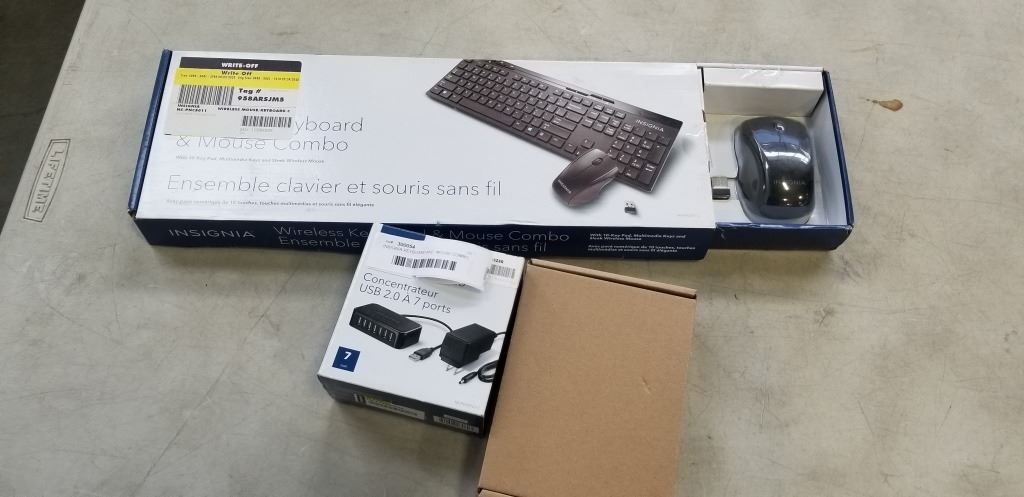 Lot 683 INSIGNIA KEYBOARD AND MOUSE COMBO, LAPTOP CHARGER, AND 7 PORT USB HUB