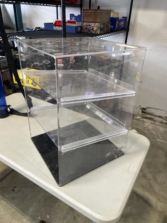 Lot 749 ACRYLIC THREE-TIER DISPLAY CASE AND ACRYLIC TUBE WITH STRAP