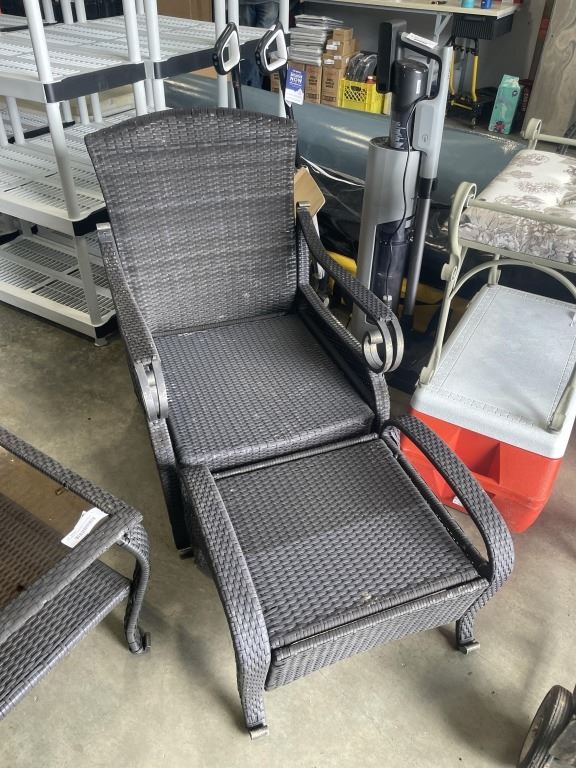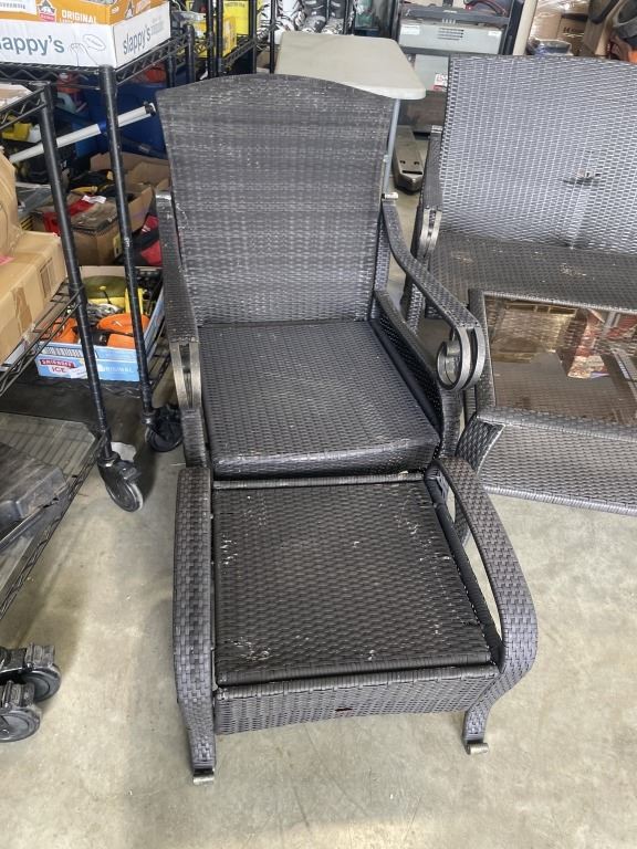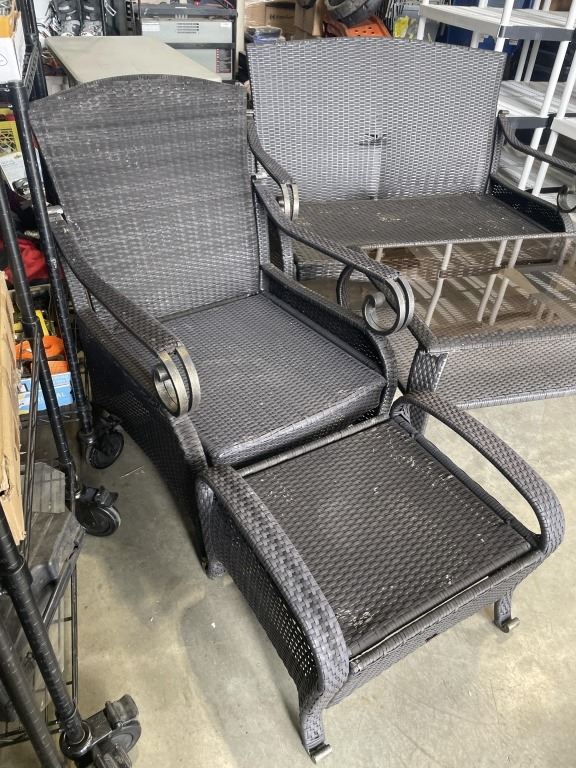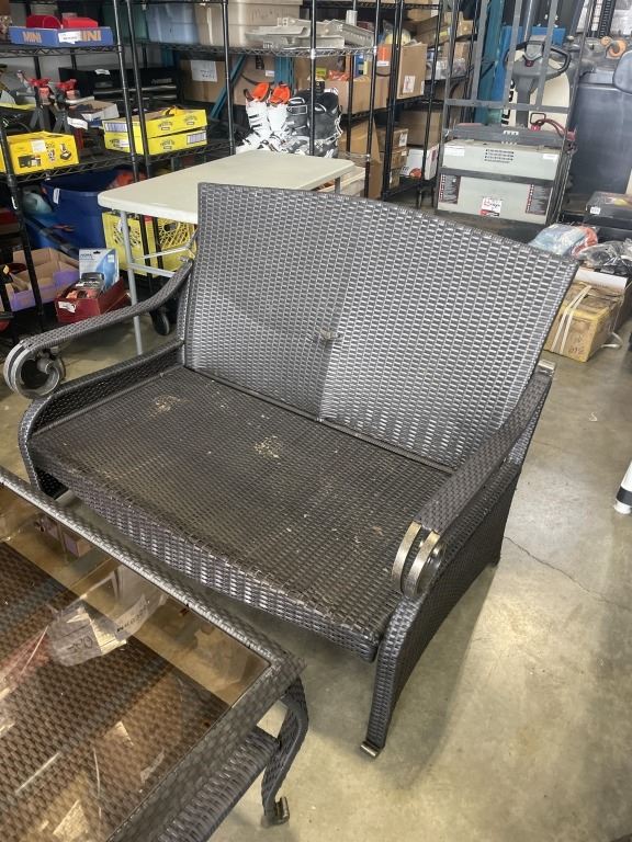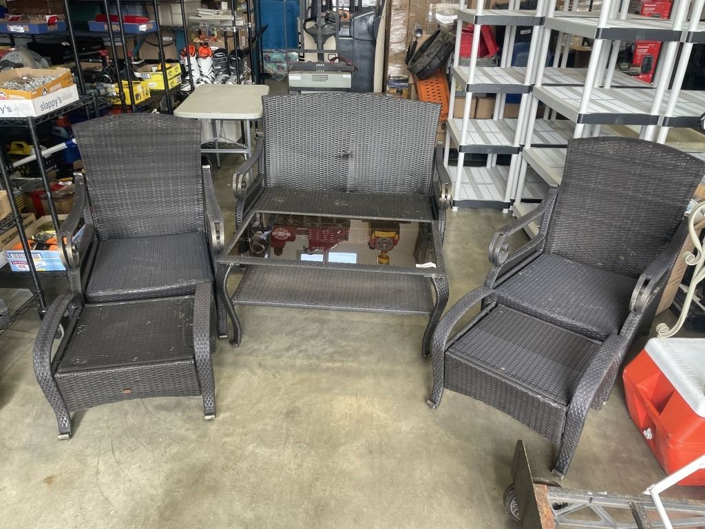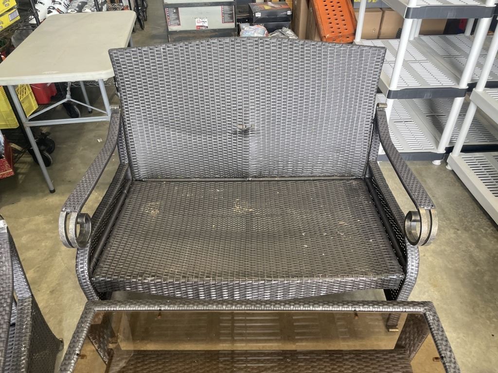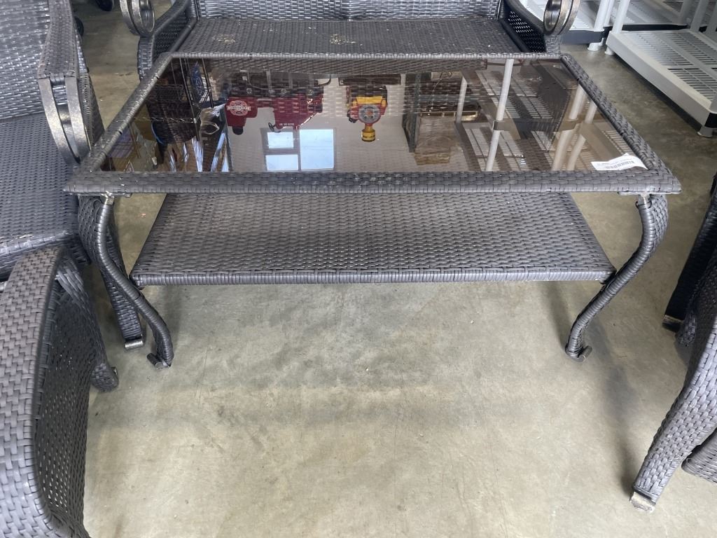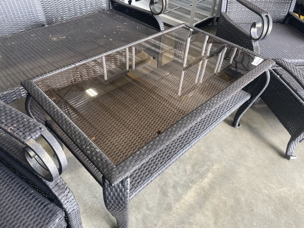 Lot 754 6PC WICKER PATIO SET - 2 CHAIRS W/ OTTOMANS, LOVE SEAT, AND GLASS TOP TABLE