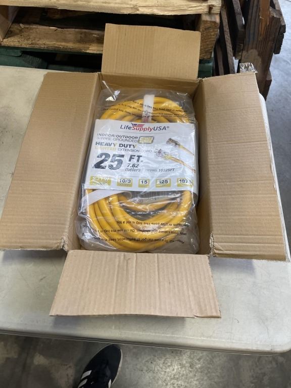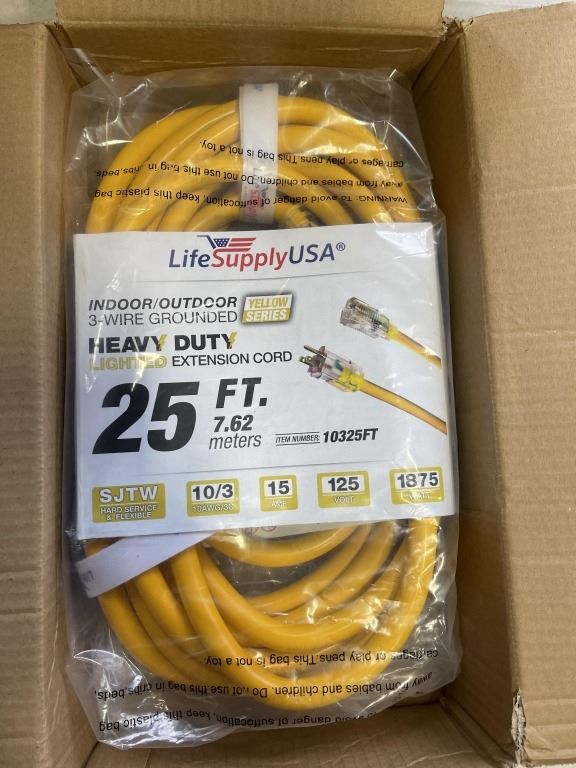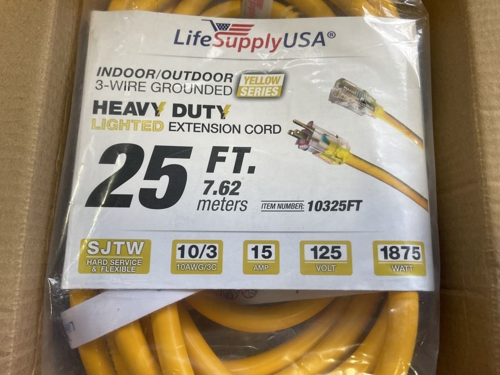 AS NEW 25FT YELLOW INDOOR OUTDOOR HEAVY DUTY LIGHTED 3 WIRE GROUNDED EXTENSION CORD 10AWG