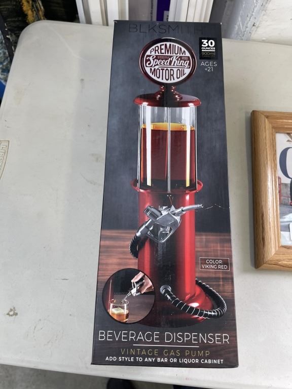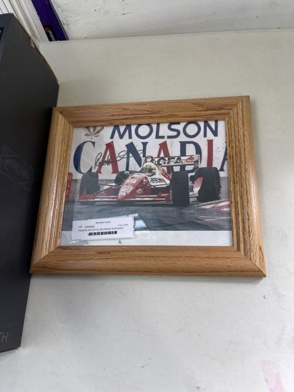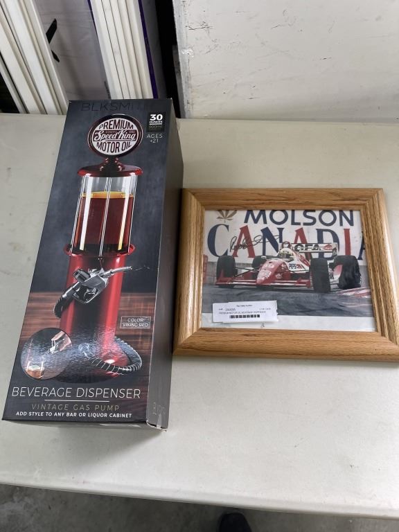 PREMIUM MOTOR OIL BEVERAGE DISPENSER AND FRAMED MOLSON INDY PRINT SIGNED