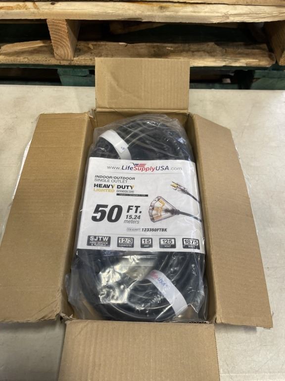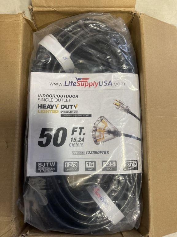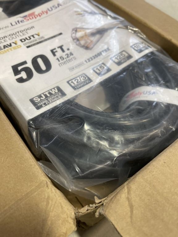 Lot 951 AS NEW 50FT BLACK 3 OUTLET INDOOR OUTDOOR HEAVY DUTY LIGHTED 3 WIRE GROUNDED EXTENSION CORD 12AWG
